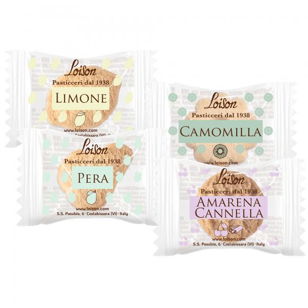Biscotti monoporzione assortiti, ricchi di gusto, pensati per tutte le occasioni dalla colazione al tE' in scatola da 200pz (1250gr confezionati singolarmente. 4 gusti: camomilla, amarena cannella, pera, limone.