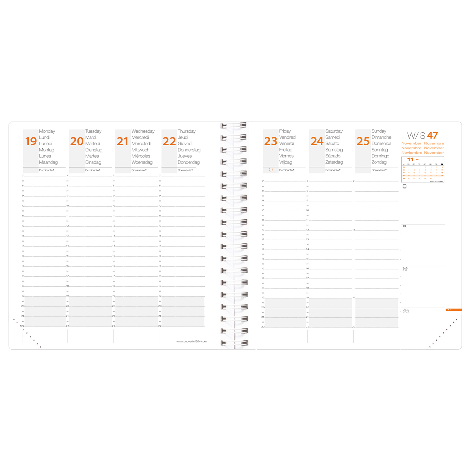Agenda settimanale da ufficio rilegatura con spirale. Una settimana su due pagine. 13 mesi da dicembre a dicembre, rubrica amovibile, 32 pagine di appunti riposizionabili, anno-Planing pieghevole. Rivestimento in grana effetto pelle, chiusura con elastico verticale e cucitura a sellaio tono su tono. Carta bianca certificata PEFC, stampa in quadricromia. Edizione multilingue.