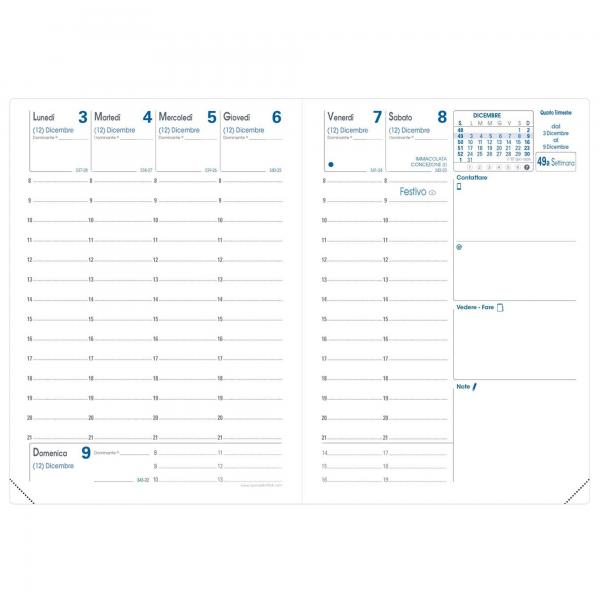 Agenda settimanale tascabile, una settimana su due pagine. 13 mesi da dicembre a dicembre, rubrica intercambiabile. Carta bianca, stampa bicolore 100% inchiostro a base vegetale. Copertina soft touch. Edizione italiana.