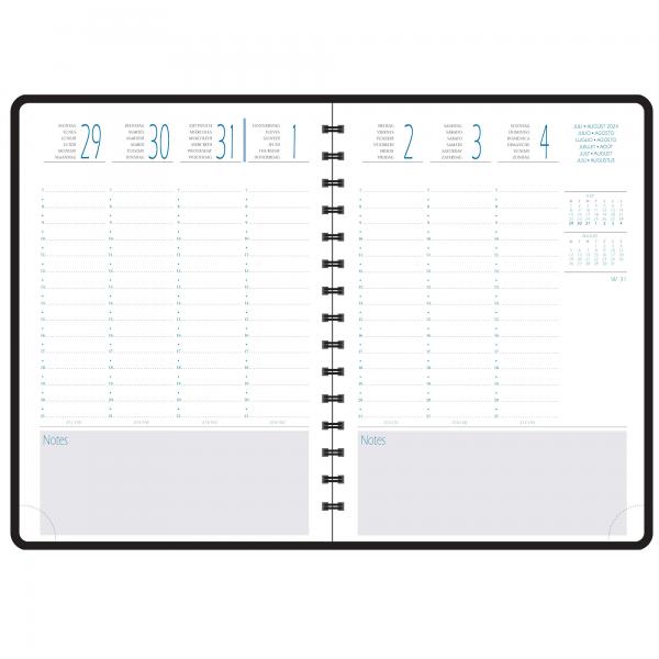 Agenda settimanale, una settimana su due pagine. 16 mesi da agosto a dicembre. Rilegatura a spirale. Carta bianca, stampa bicolore, Tasca trasparente portatelefono, tasca portadocumenti, biglietti da visita, scontrini. Dotato di portapenne e blocco 64 pagine. Versione multilingue.