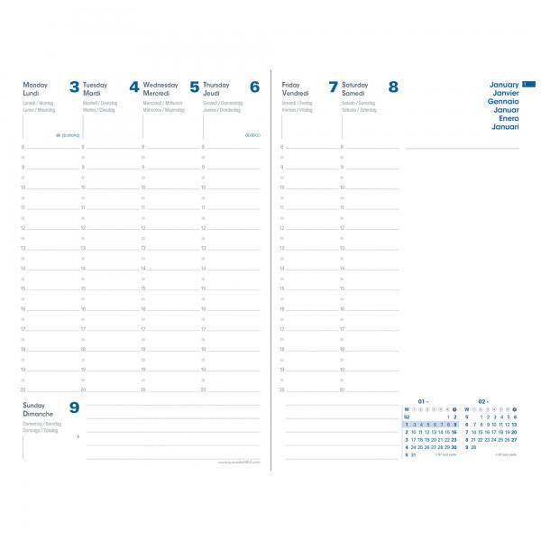 Agenda settimanale da ufficio, una settimana su due pagine. 13 mesi da dicembre a dicembre. Rubrica amovibile, carta 100% riciclata, certificata Blue Angel, stampa bicolore 100% inchiostro a base vegetale, rilegatura cucita. Copertina senza pftalati. Edizione multilinque.