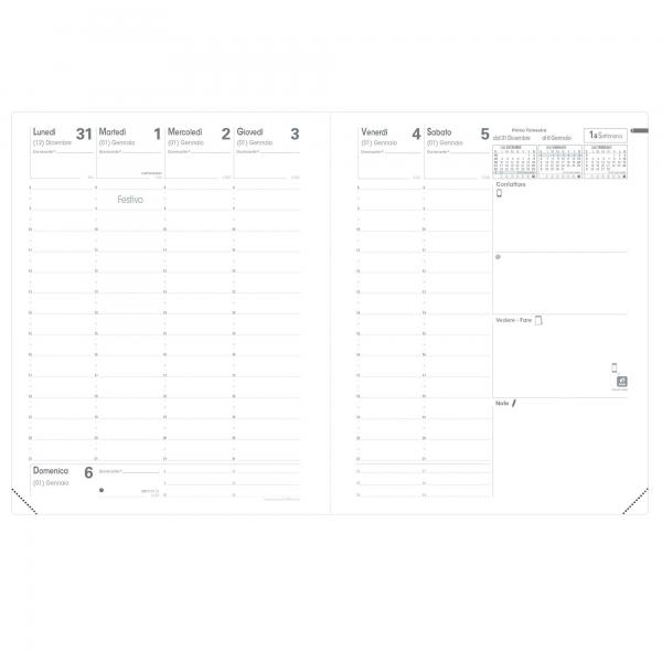 Agenda settimanale da ufficio, una settimana su due pagine. 13 mesi da dicembre a dicembre. Rubrica intercambiabile. Carta bianca certificata PEFC, stampa bicolore, rilegatura cucita. Edizione italiana.