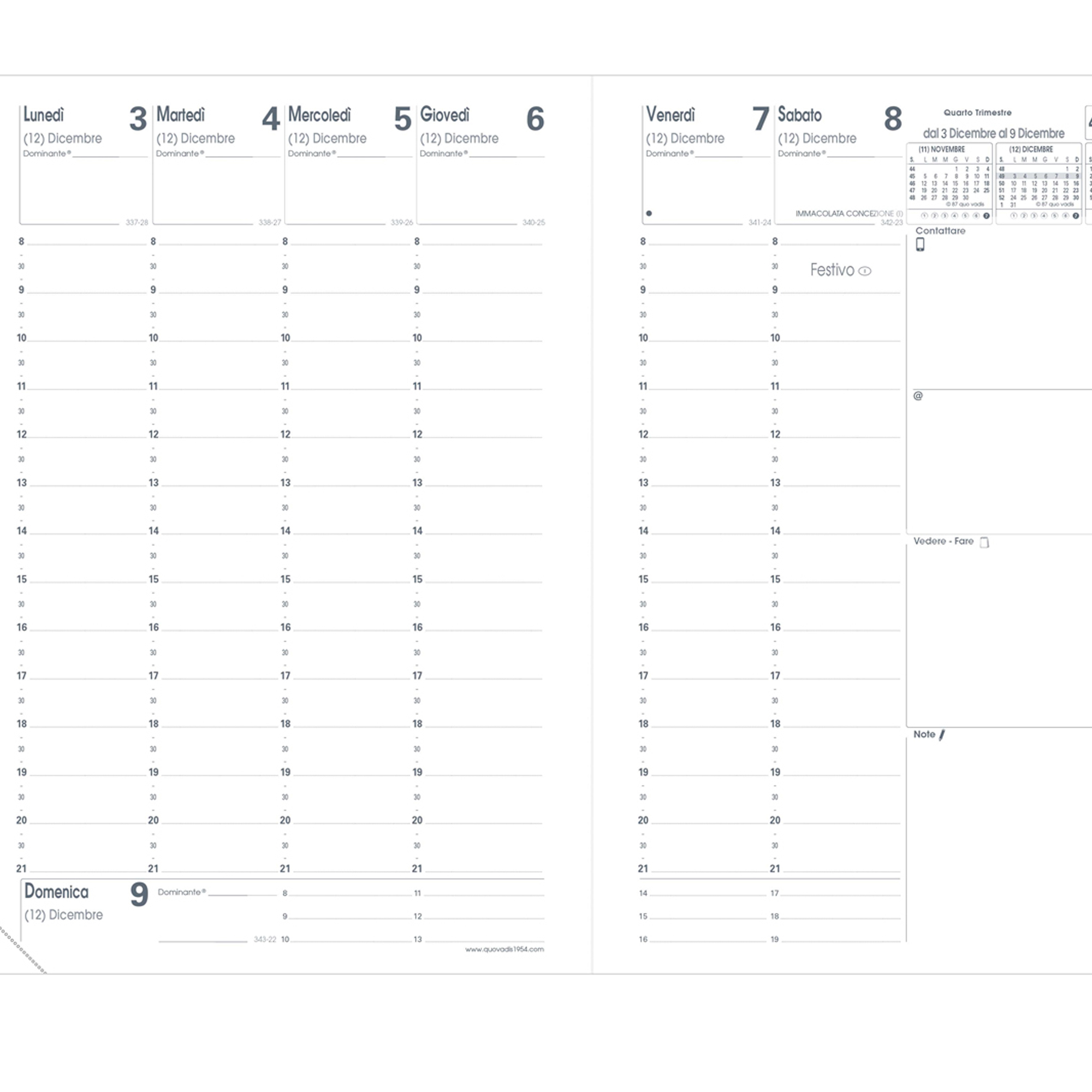 Agenda settimanale da ufficio, una settimana su due pagine. 13 mesi da dicembre a dicembre. Carta bianca certificata PEFC, stampa bicolore, rilegatura cucita. Edizione italiana.