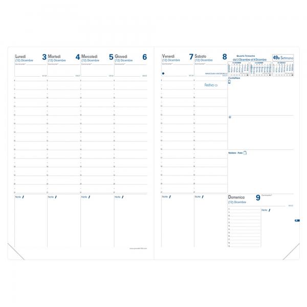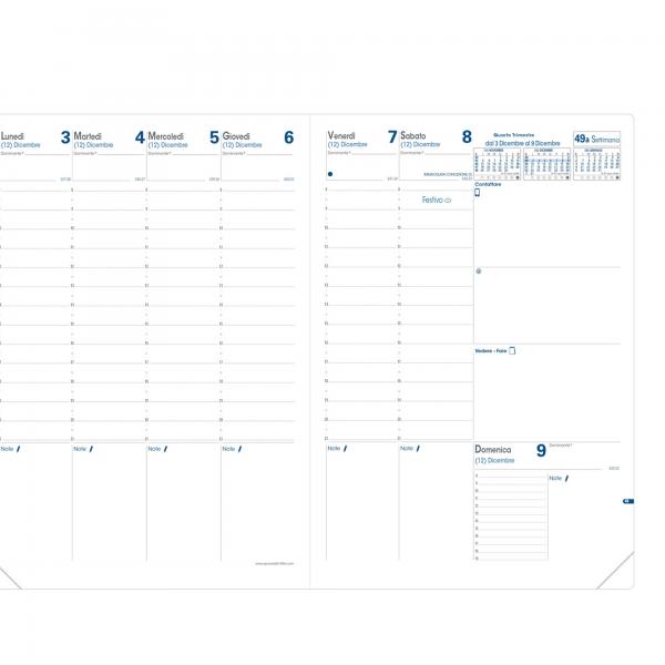 Agenda settimanale da ufficio, una settimana su due pagine con annotazioni giornaliere. 13 mesi da dicembre a dicembre. Carta bianca certificata PEFC stampa bicolore, rilegatura cucita. Edizione italiana.
