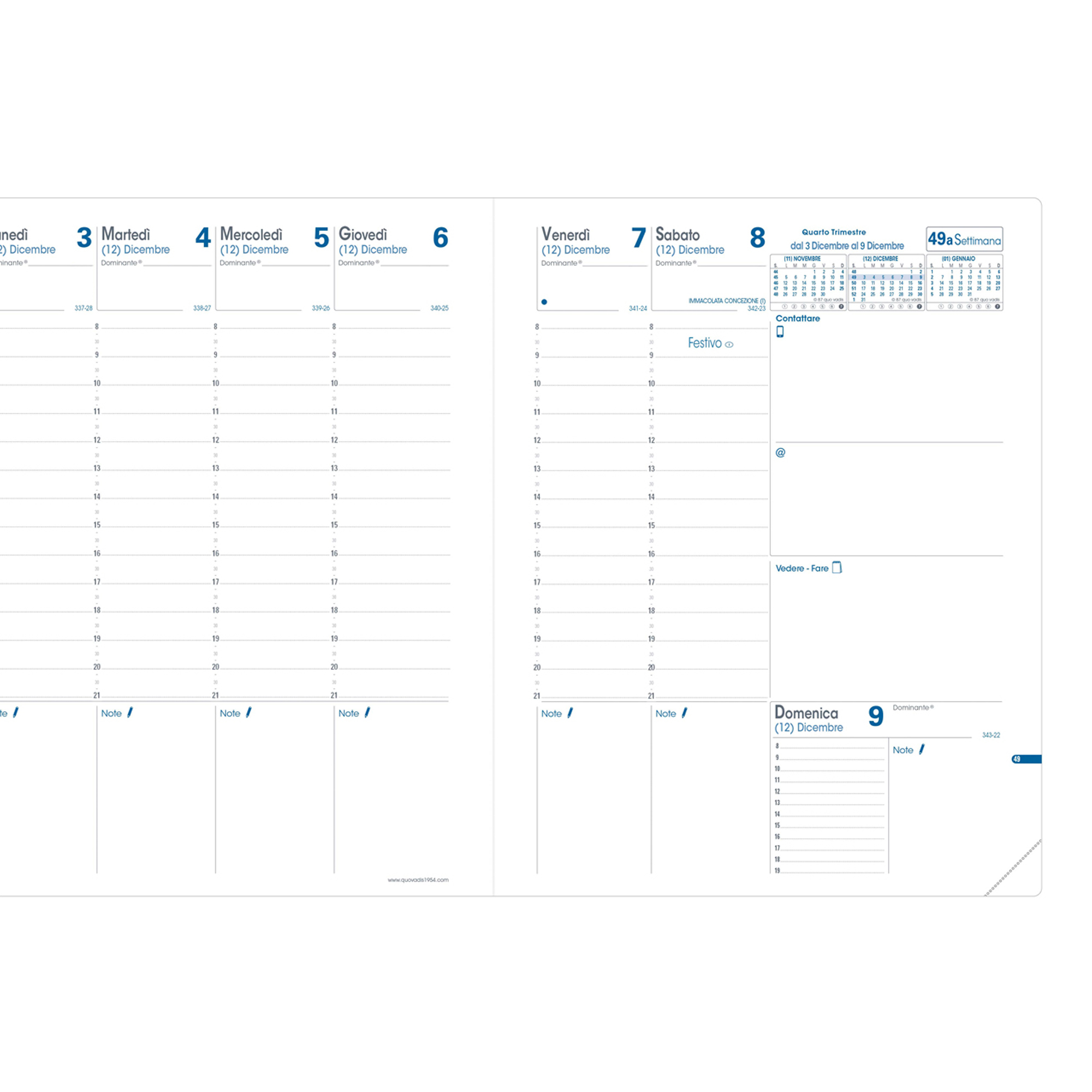 Agenda settimanale da ufficio, una settimana su due pagine con annotazioni giornaliere. 13 mesi da dicembre a dicembre. Carta bianca certificata PEFC, stampa bicolore, rilegatura cucita. Edizione italiana.