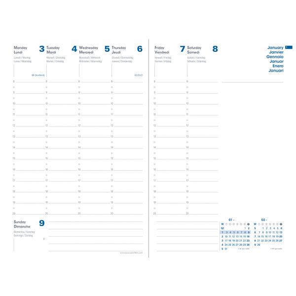 Articolo in prenotazione, in consegna a partire dal mese di luglio 2025.Agenda settimanale da ufficio, una settimana su due pagine. 13 mesi da dicembre a dicembre, rubrica intercambiabile. Carta 100% riciclata certificata Blue Angel, stampa bicolore 100% inchiostro vegetale. Copertina senza ftalati con nuovo marchio scavato elegante.