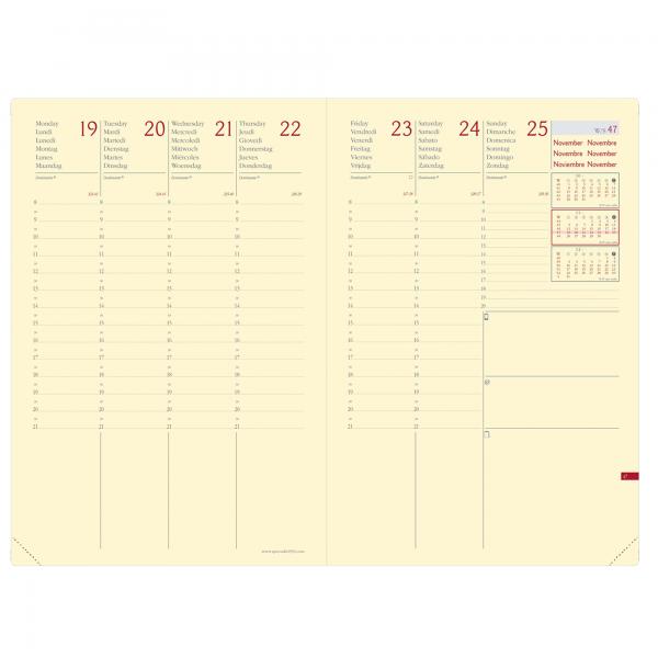 Agenda settimanale da ufficio, una settimana su due pagine. 13 mesi da dicembre a dicembre, multilingua, pagine note intercambiabili. Dotata di tasca a soffietto portabiglietti, segnalibro e chiusura con elastico verticale. Carta avorio certificata PEFC, stampa bicolore, rilegatura cucita.