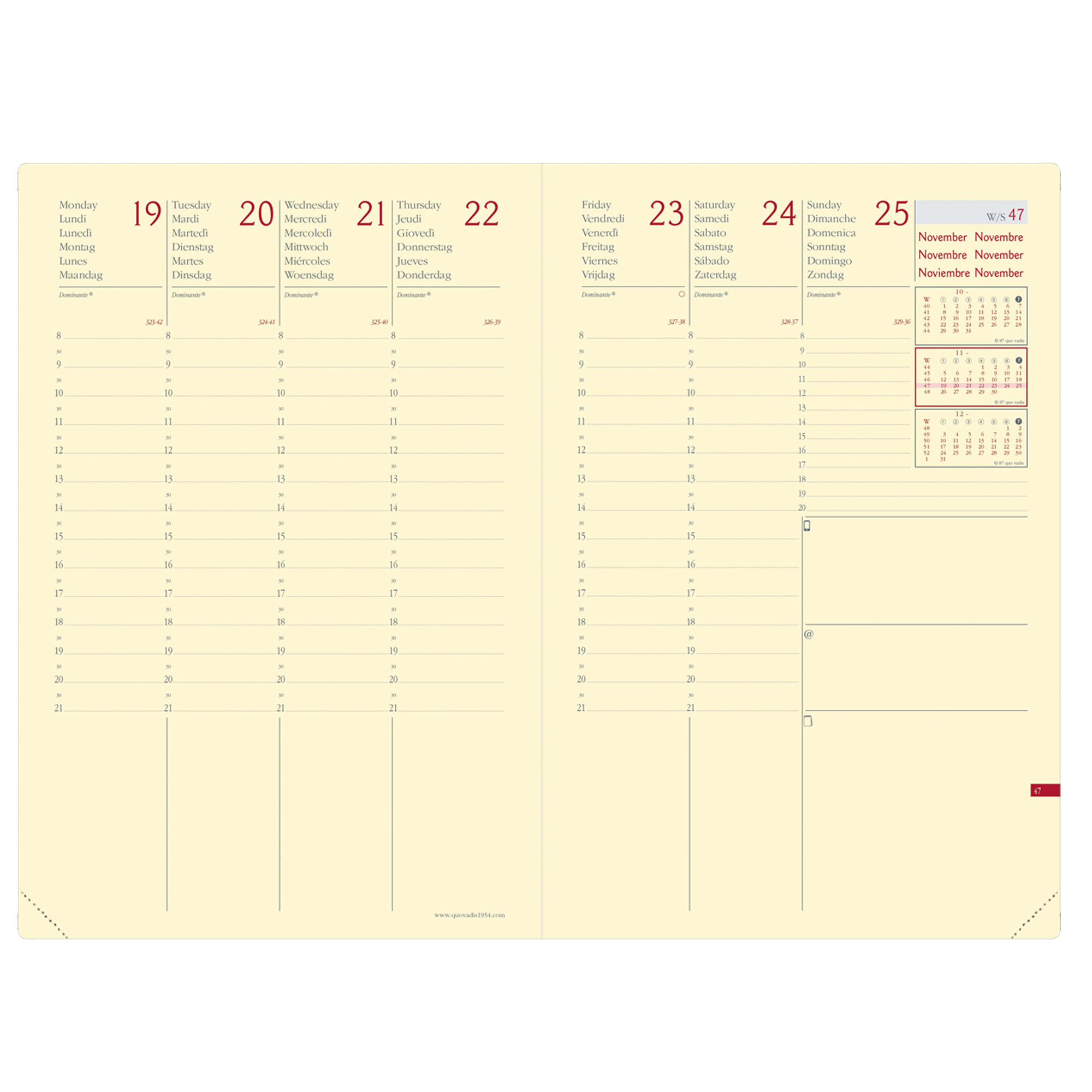 Agenda settimanale da ufficio, una settimana su due pagine. 13 mesi da dicembre a dicembre, multilingua, pagine note intercambiabili. Dotata di tasca a soffietto portabiglietti, segnalibro e chiusura con elastico verticale. Carta avorio certificata PEFC, stampa bicolore, rilegatura cucita.