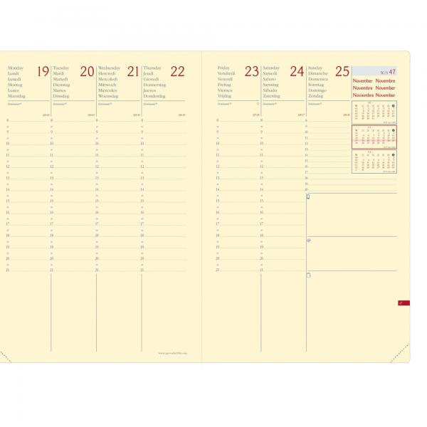 Agenda settimanale da ufficio, una settimana su due pagine. 13 mesi da dicembre a dicembre, multilingua, pagine note intercambiabili. Dotata di tasca a soffietto portabiglietti, segnalibro e chiusura con elastico verticale. Carta avorio certificata PEFC, stampa bicolore, rilegatura cucita.
