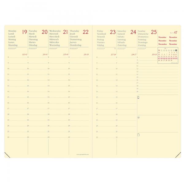 Agenda settimanale da ufficio, una settimana su due pagine. 13 mesi d dicembre a dicembre, pagine note intercambiabili, multilingue. Dotata di tasca a soffietto portabiglietti, chiusura con elastico verticale. Carta avorio certificata PEFC, stampa bicolore, rilegatura cucita.