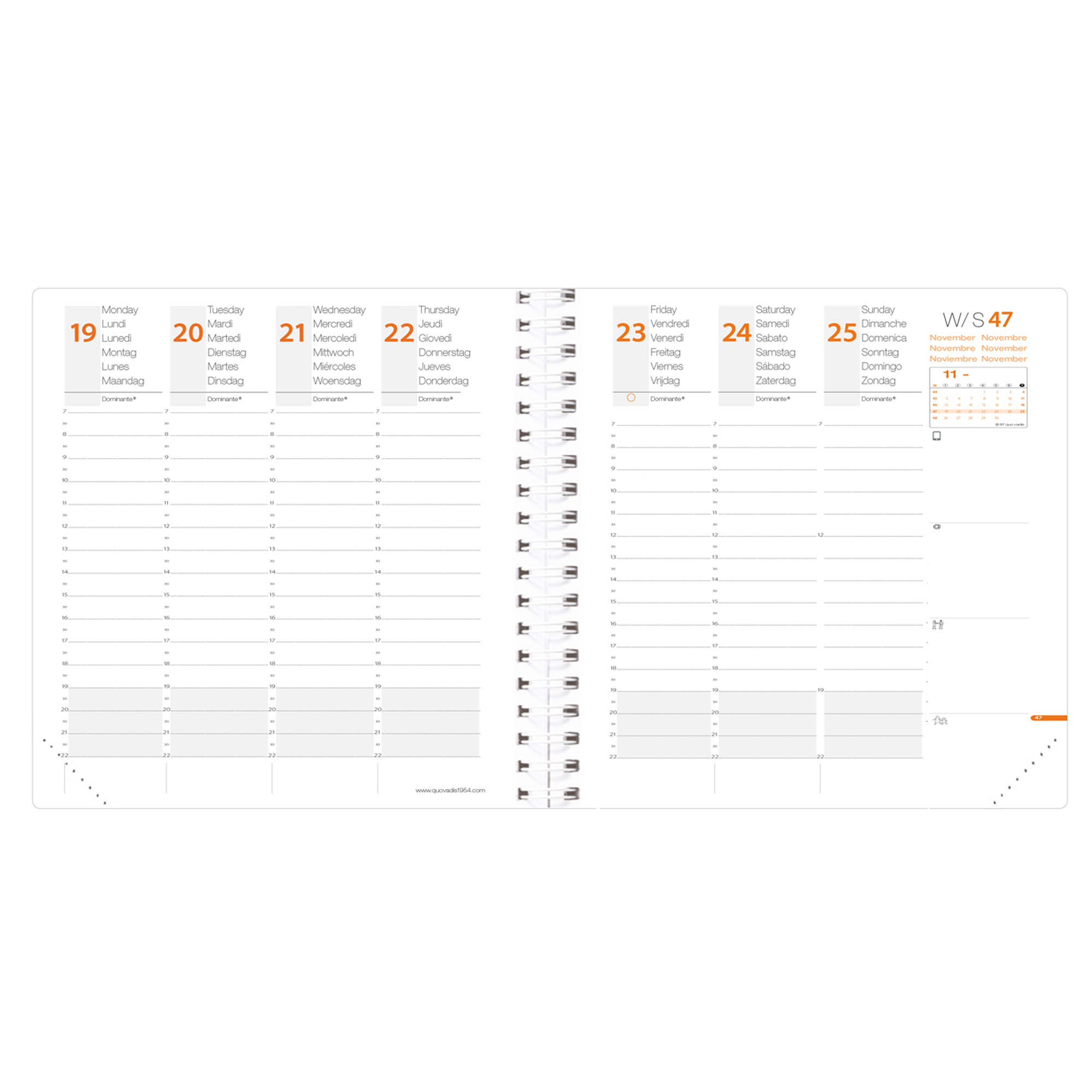 Agenda settimanale da ufficio rilegatura con spirale. Una settimana su due pagine. 13 mesi da dicembre a dicembre, rubrica amovibile, 32 pagine di appunti riposizionabili, anno-Planing pieghevole. Rivestimento in grana effetto pelle, chiusura con elastico verticale e cucitura a sellaio tono su tono. Carta bianca certificata PEFC, stampa in quadricromia. Edizione multilingue.