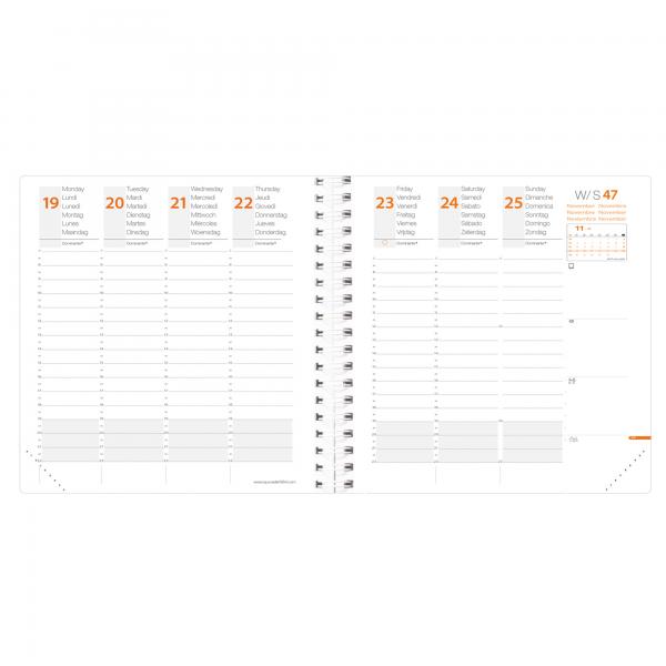 Agenda settimanale da ufficio rilegatura con spirale. Una settimana su due pagine. 13 mesi da dicembre a dicembre, rubrica amovibile, 32 pagine di appunti riposizionabili, anno-Planing pieghevole. Rivestimento in grana effetto pelle, chiusura con elastico verticale e cucitura a sellaio tono su tono. Carta bianca certificata PEFC, stampa in quadricromia. Edizione multilingue.