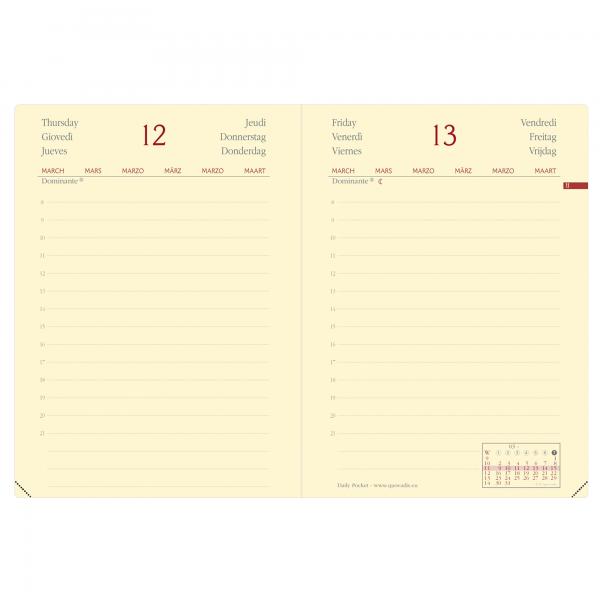 Agenda giornaliera tascabile, un giorno per pagina. 12 mesi da gennaio a dicembre, schema multilingue e pagine note intercambiabili, tasca con soffietto portabiglietti. Carta color avorio certificata PEFC stampa bicolore, rilegatura cucita e chiusura con elastico.