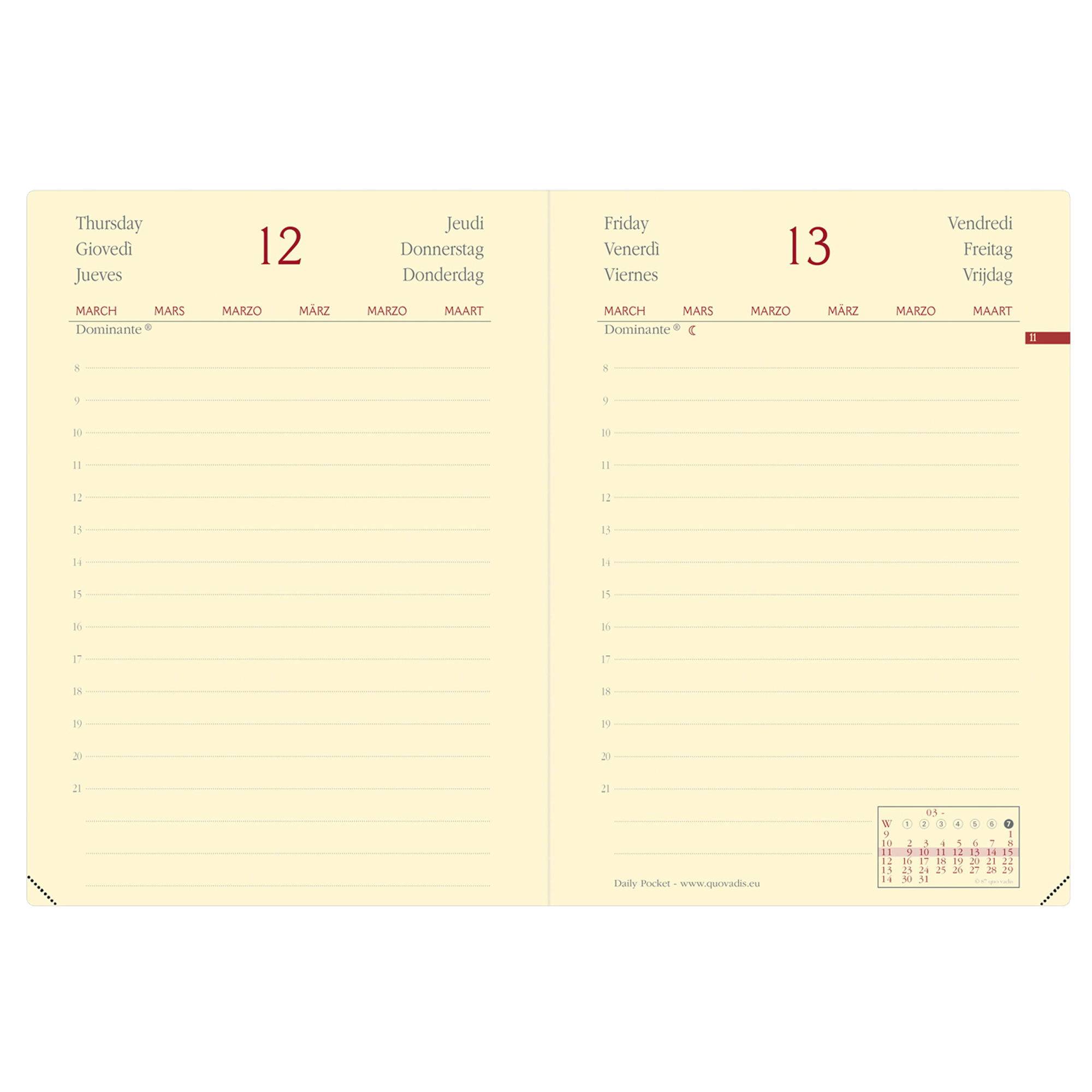 Agenda giornaliera tascabile, un giorno per pagina. 12 mesi da gennaio a dicembre, schema multilingue e pagine note intercambiabili, tasca con soffietto portabiglietti. Carta color avorio certificata PEFC stampa bicolore, rilegatura cucita e chiusura con elastico.