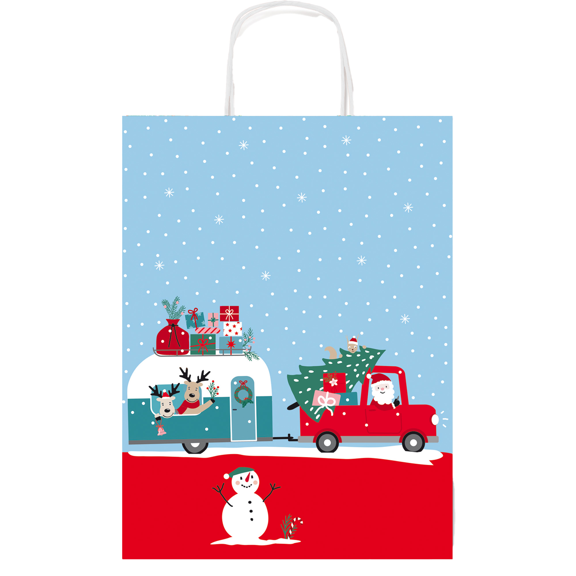 Shopper regalo realizzato in carta kraft bianco con stampe a colori. Dotato di manici in carta ritorta. Assortimento di 5 differente fantasie natalizie. Composto da 25