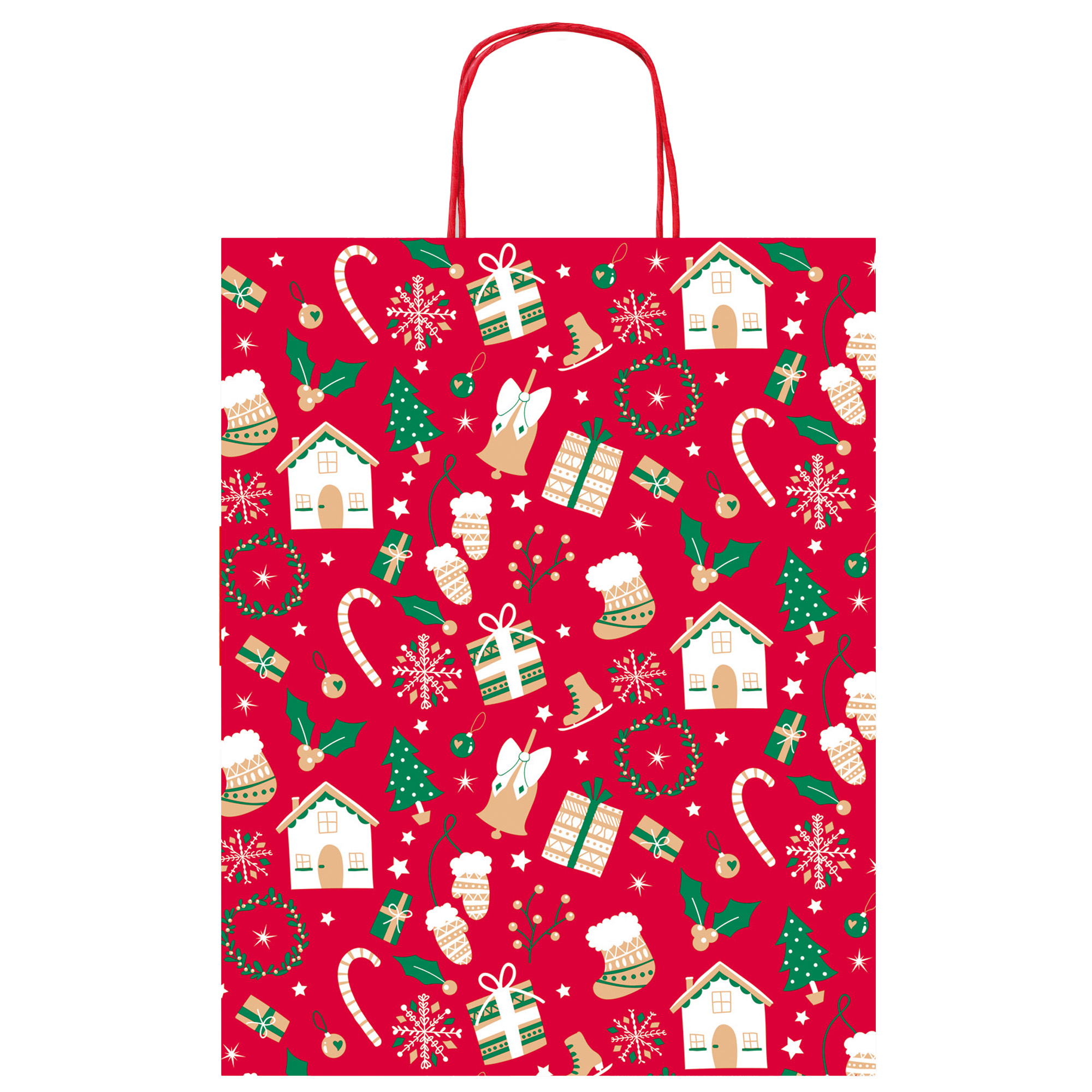 Shopper regalo realizzato in carta kraft bianco con stampe a colori. Dotato di manici in carta ritorta. Assortimento di 5 differente fantasie natalizie. Composto da 25