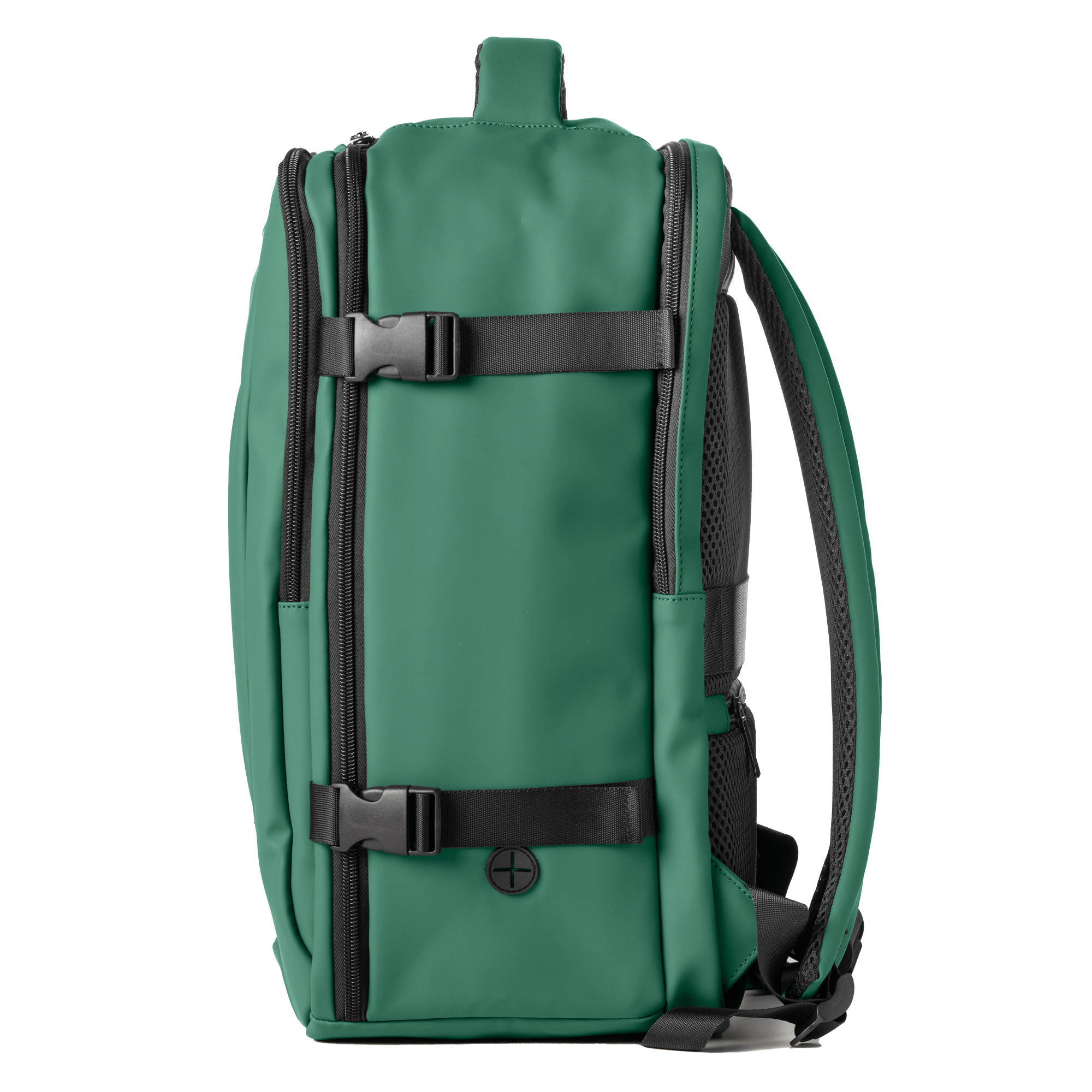 Zaino in gomma antipioggia, tasca frontale portachiavi e tasca frontale portadocumenti. Grande vano centrale con tasche porta accessori, presa esterna per cuffie. Tasca posteriore porta notebook 15. Tasca posteriore e nastro per inserimento su trolley. Tracolle e schienale imbottite e dotato di maniglia di trasporto. Cinghie laterali per compressione. Bagaglio a mano approvato Ryanair.