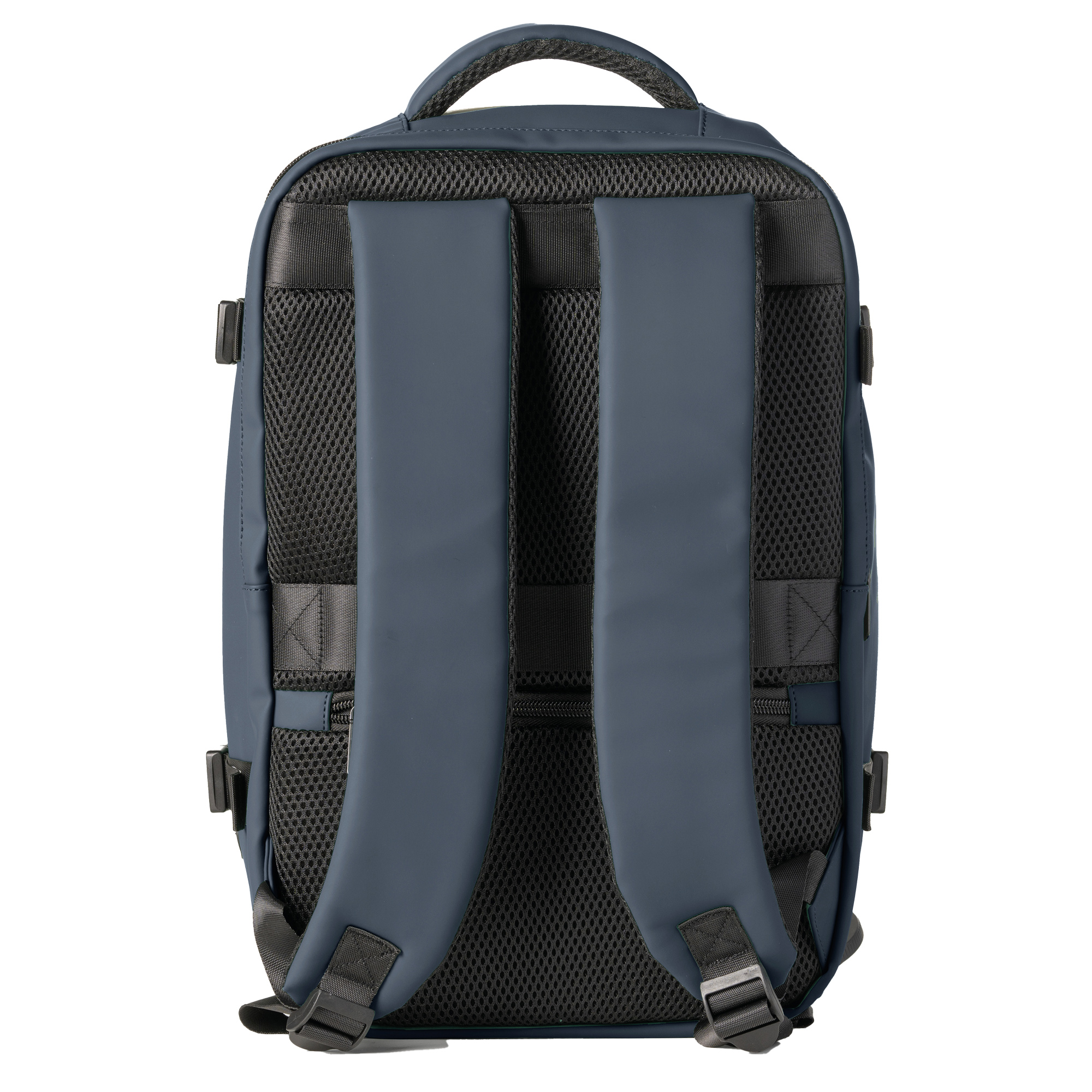 Zaino in gomma antipioggia, tasca frontale portachiavi e tasca frontale portadocumenti. Grande vano centrale con tasche porta accessori, presa esterna per cuffie. Tasca posteriore porta notebook 15. Tasca posteriore e nastro per inserimento su trolley. Tracolle e schienale imbottite e dotato di maniglia di trasporto. Cinghie laterali per compressione. Bagaglio a mano approvato Ryanair.