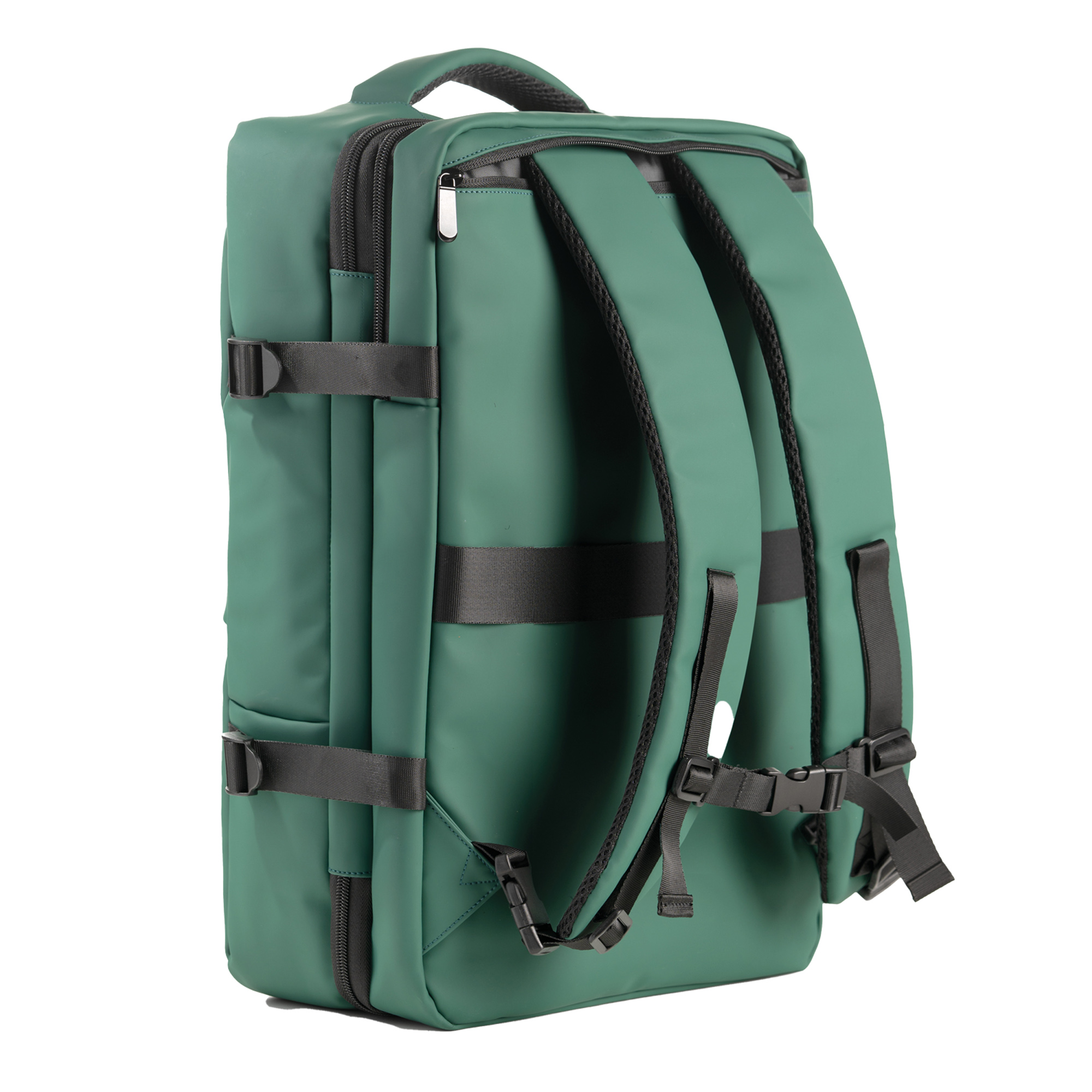 Zaino in gomma antipioggia. Tre tasche frontali portachiavi e accessori. Grande vano centrale con separatore in rete, tasca posteriore con porta notebook imbottito 15. Vano posteriore con tracolle imbottite estraibili, schienale dotato di nastro per trolley. Doppia maniglia imbottita per trasporto e cinghie laterali per compressione. Bagaglio a mano approvato EasyJet.