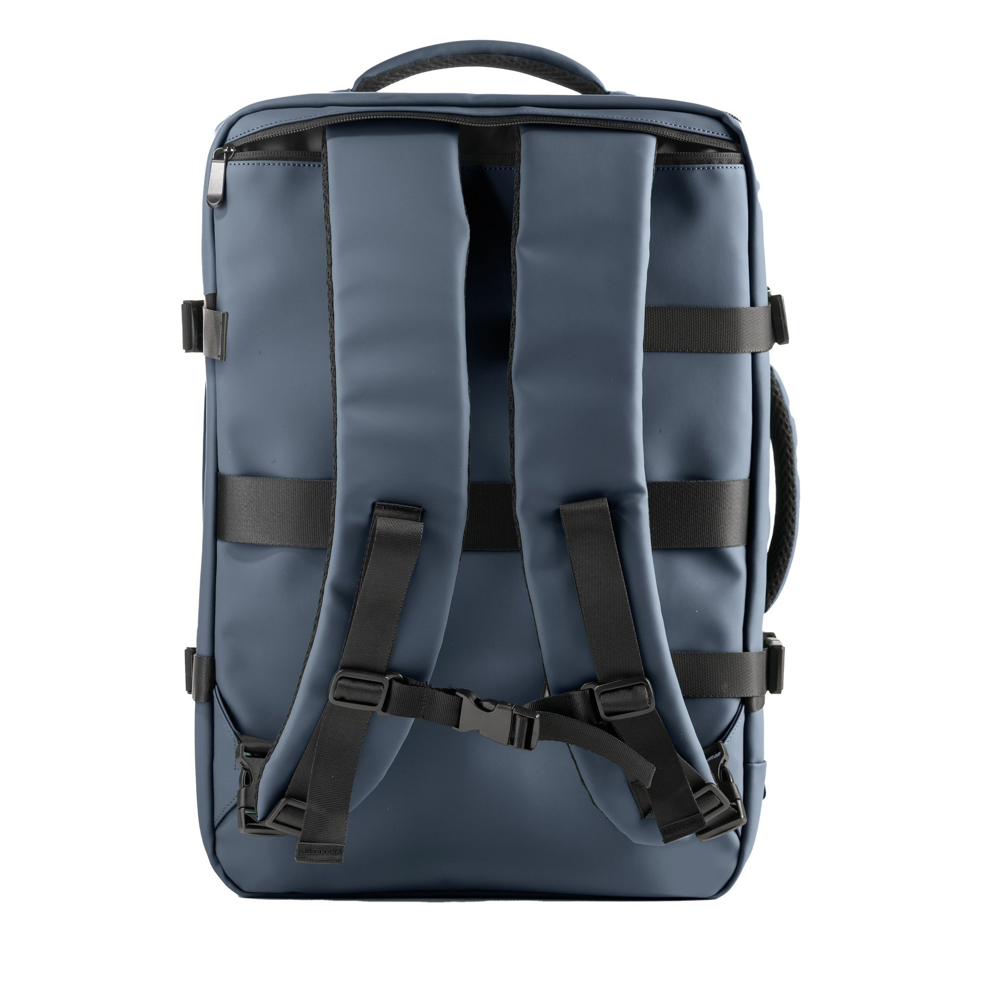 Zaino in gomma antipioggia. Tre tasche frontali portachiavi e accessori. Grande vano centrale con separatore in rete, tasca posteriore con porta notebook imbottito 15. Vano posteriore con tracolle imbottite estraibili, schienale dotato di nastro per trolley. Doppia maniglia imbottita per trasporto e cinghie laterali per compressione. Bagaglio a mano approvato EasyJet.
