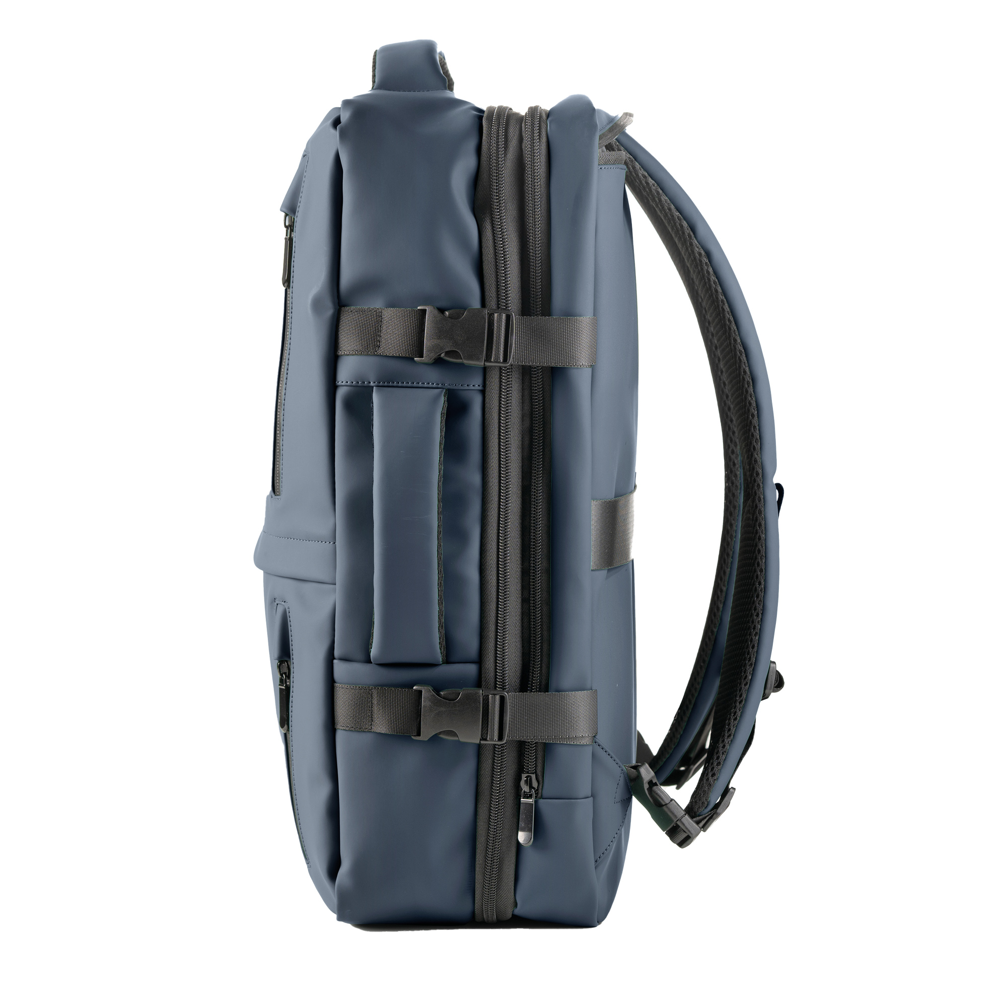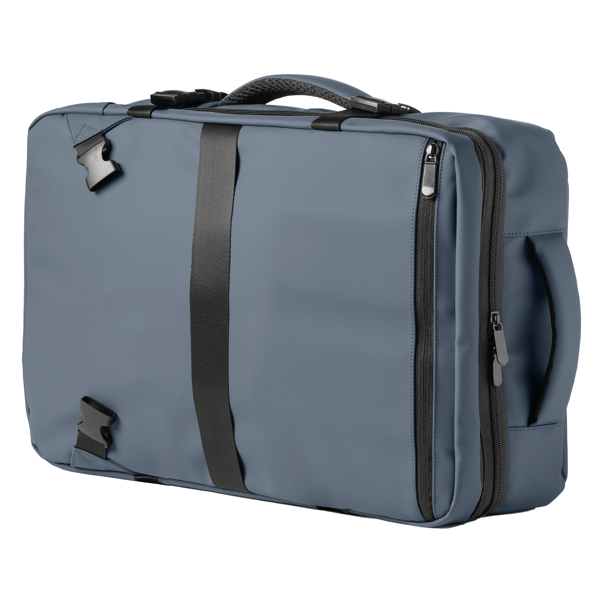 Zaino in gomma antipioggia. Tre tasche frontali portachiavi e accessori. Grande vano centrale con separatore in rete, tasca posteriore con porta notebook imbottito 15. Vano posteriore con tracolle imbottite estraibili, schienale dotato di nastro per trolley. Doppia maniglia imbottita per trasporto e cinghie laterali per compressione. Bagaglio a mano approvato EasyJet.