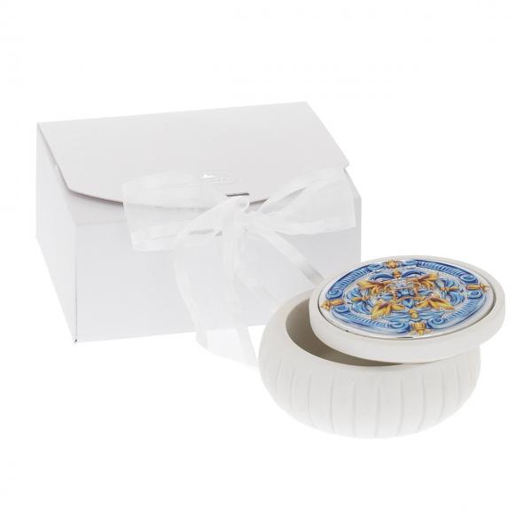 SCATOLINA QUADRATA BIANCA CON FESONI 8*8*4 CON DECO MAIOLICA