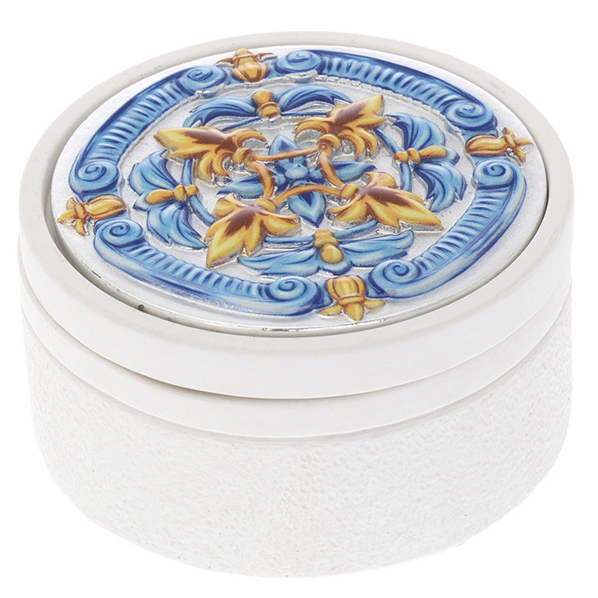 SCATOLINA TONDA BIANCA CON FESONI D. 8,5*4 CON DECO MAIOLICA