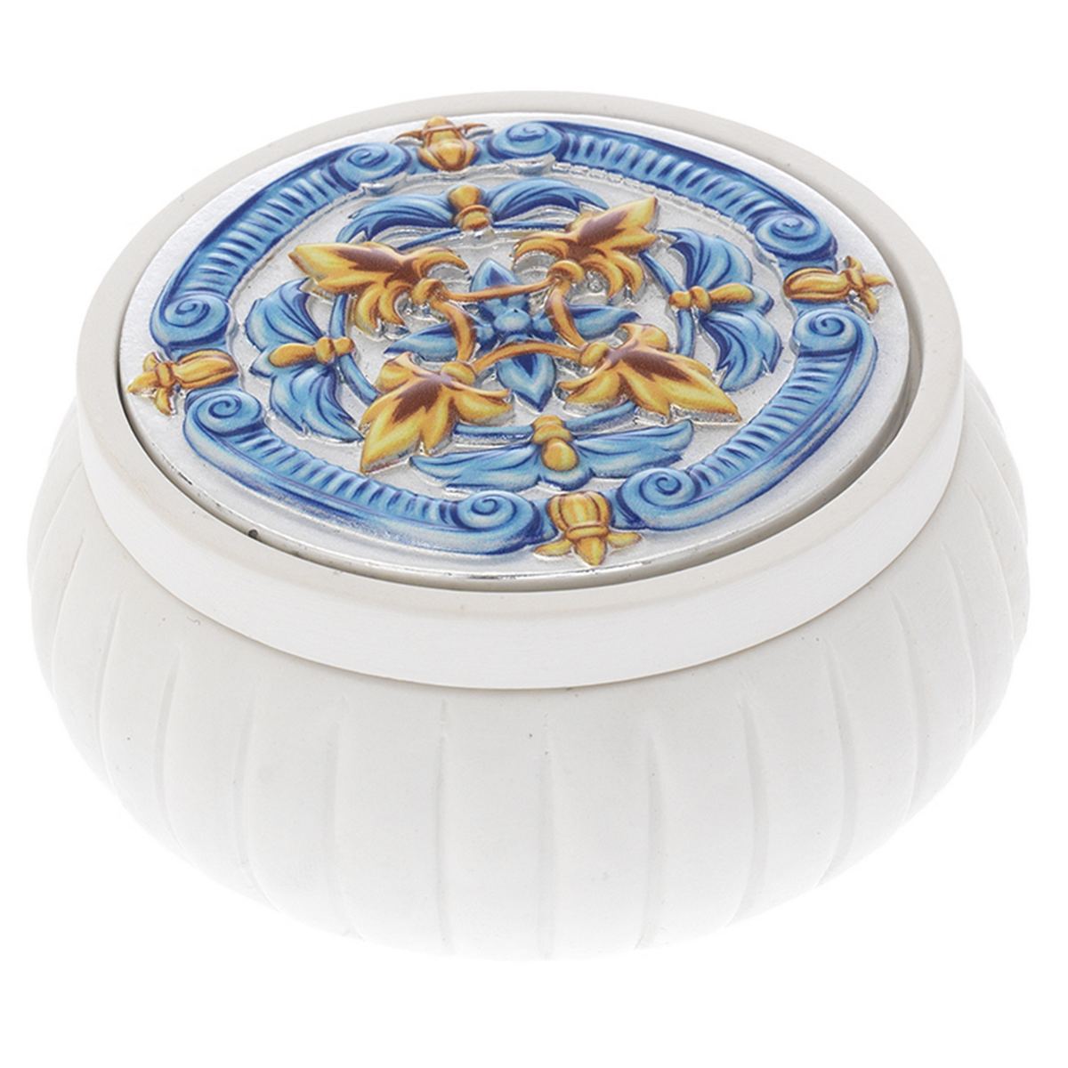 SCATOLINA TONDA BIANCA LISCIA D. 7,5*4 CON DECO MAIOLICA
