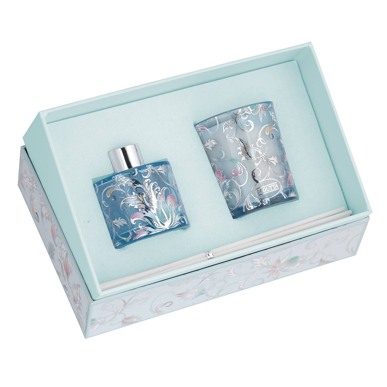 ASTUCCIO CON 50ml + STICKS + CANDELA 70gr - floglie azzurro Cannella