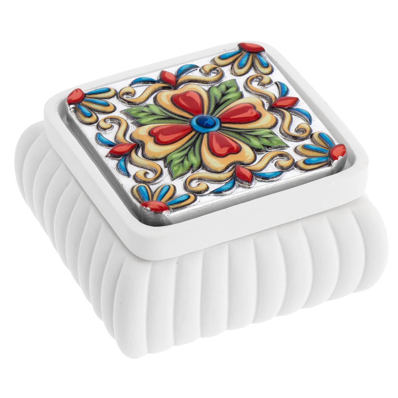 SCATOLINA QUADRATA BIANCA CON FESONI 8*8*4 CON DECO STAMPATA 1