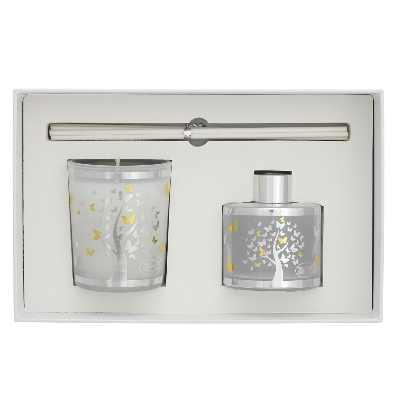 ASTUCCIO CON 50ml + STICKS + CANDELA 70gr - ALBERO CON FARFALLE BIANCO Vaniglia noir