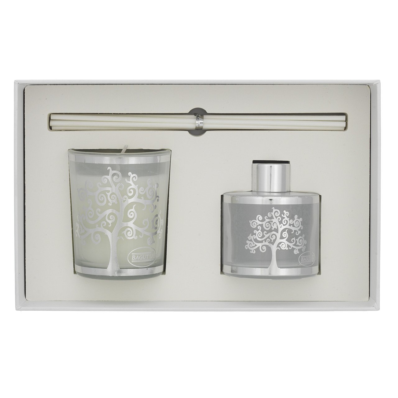 ASTUCCIO CON 50ml + STICKS + CANDELA 70gr - ALBERO STILIZZATO BIANCO Vaniglia noir