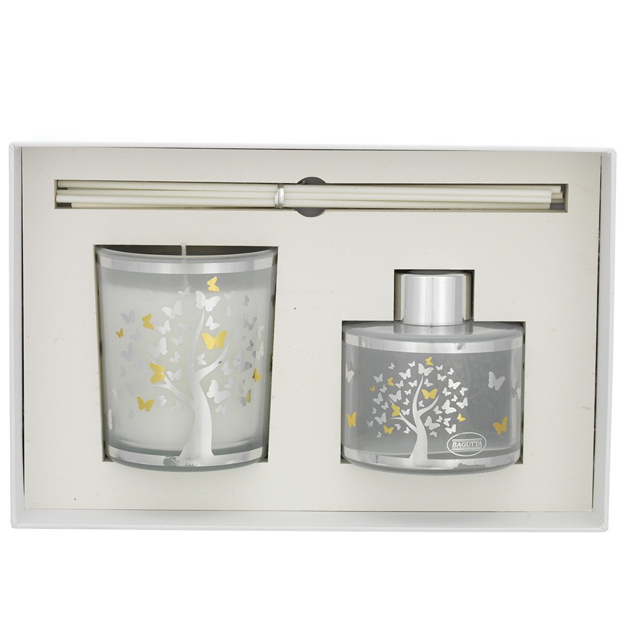 ASTUCCIO CON 100ml + STICKS + CANDELA 150gr - ALBERO CON FARFALLE BIANCO Vaniglia noir
