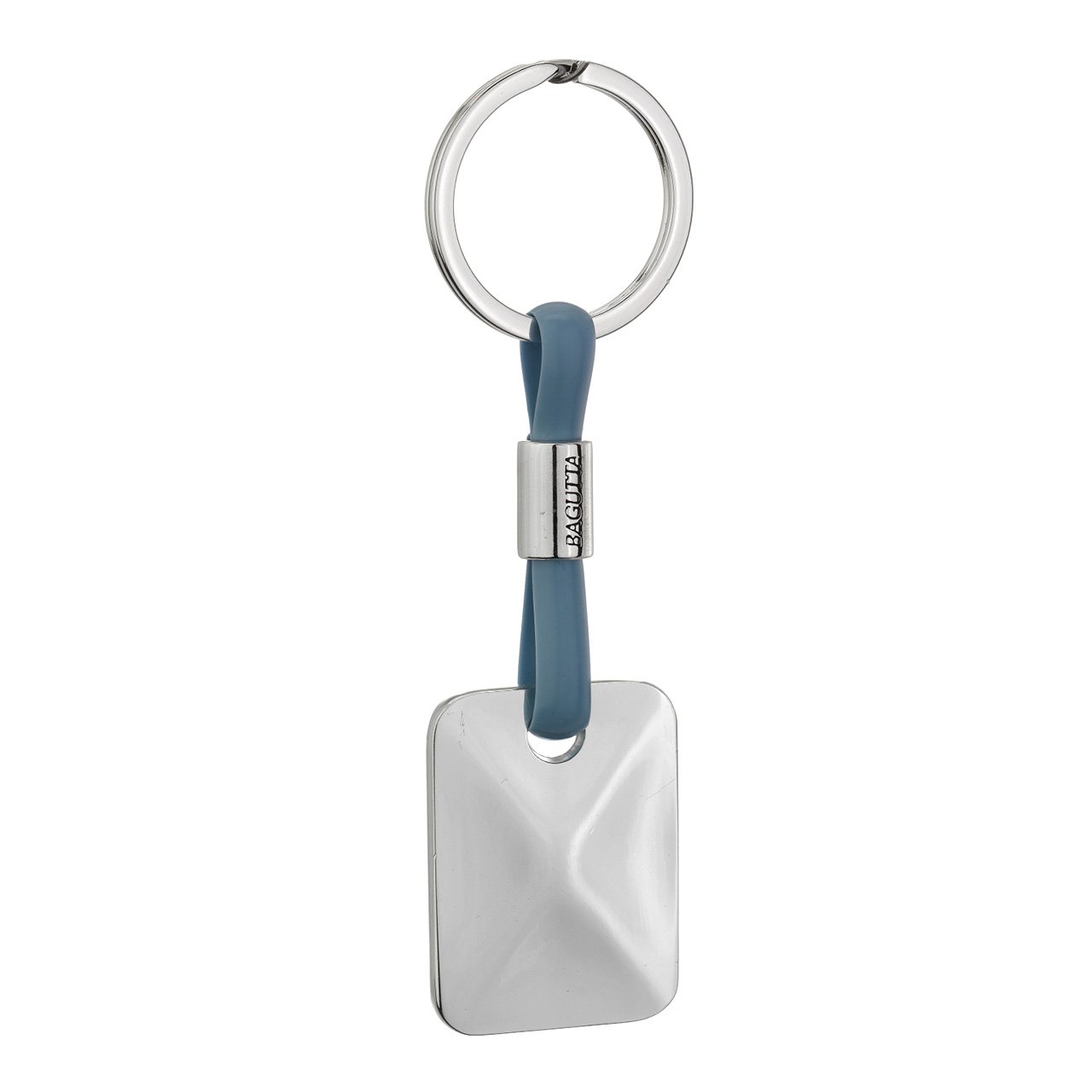 PORTACHIAVI SILVER PLATED CON TARGHETTA RETTANGOLARE CORDONE IN SILICONE AZZURRO