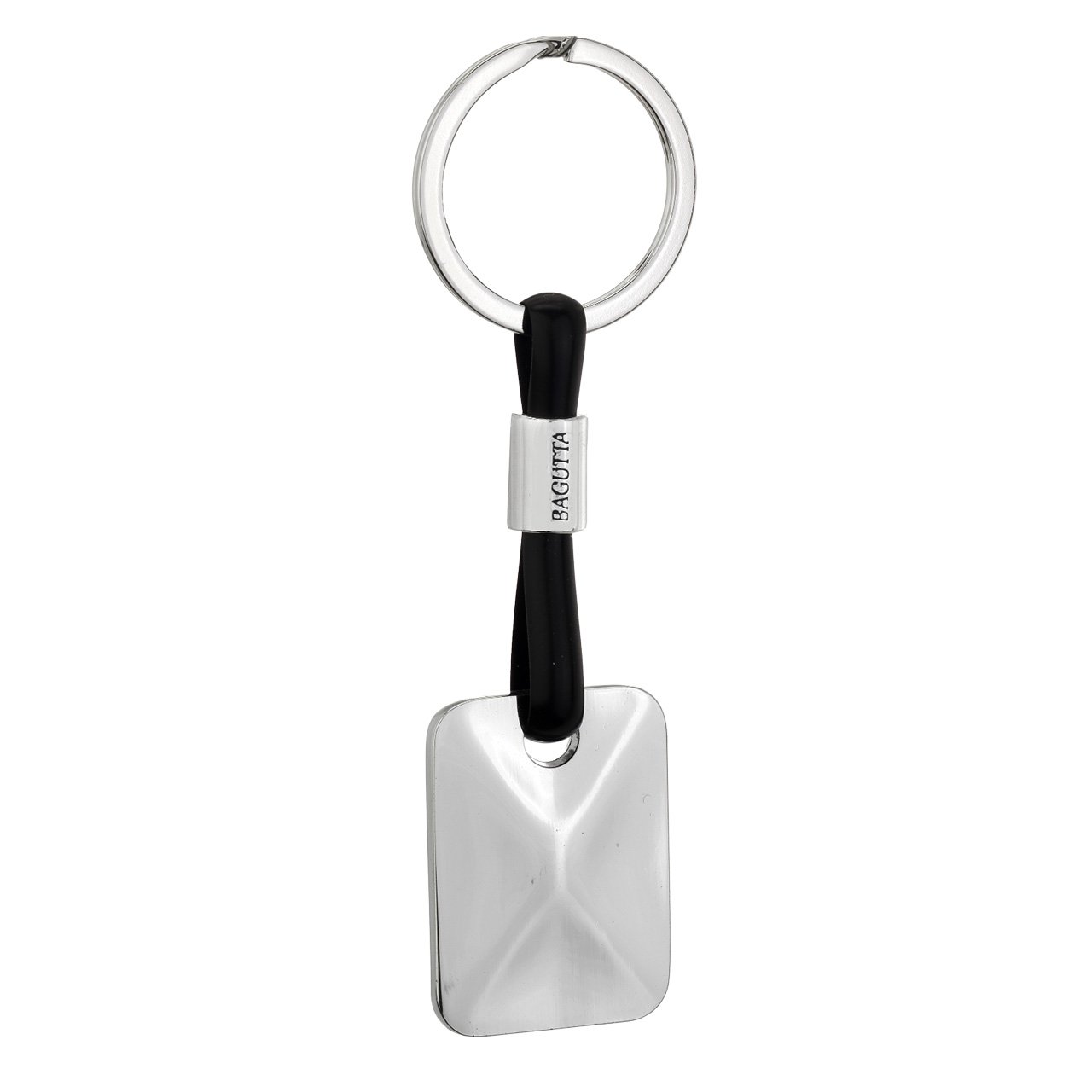 PORTACHIAVI SILVER PLATED CON TARGHETTA RETTANGOLARE CORDONE IN SILICONE NERO