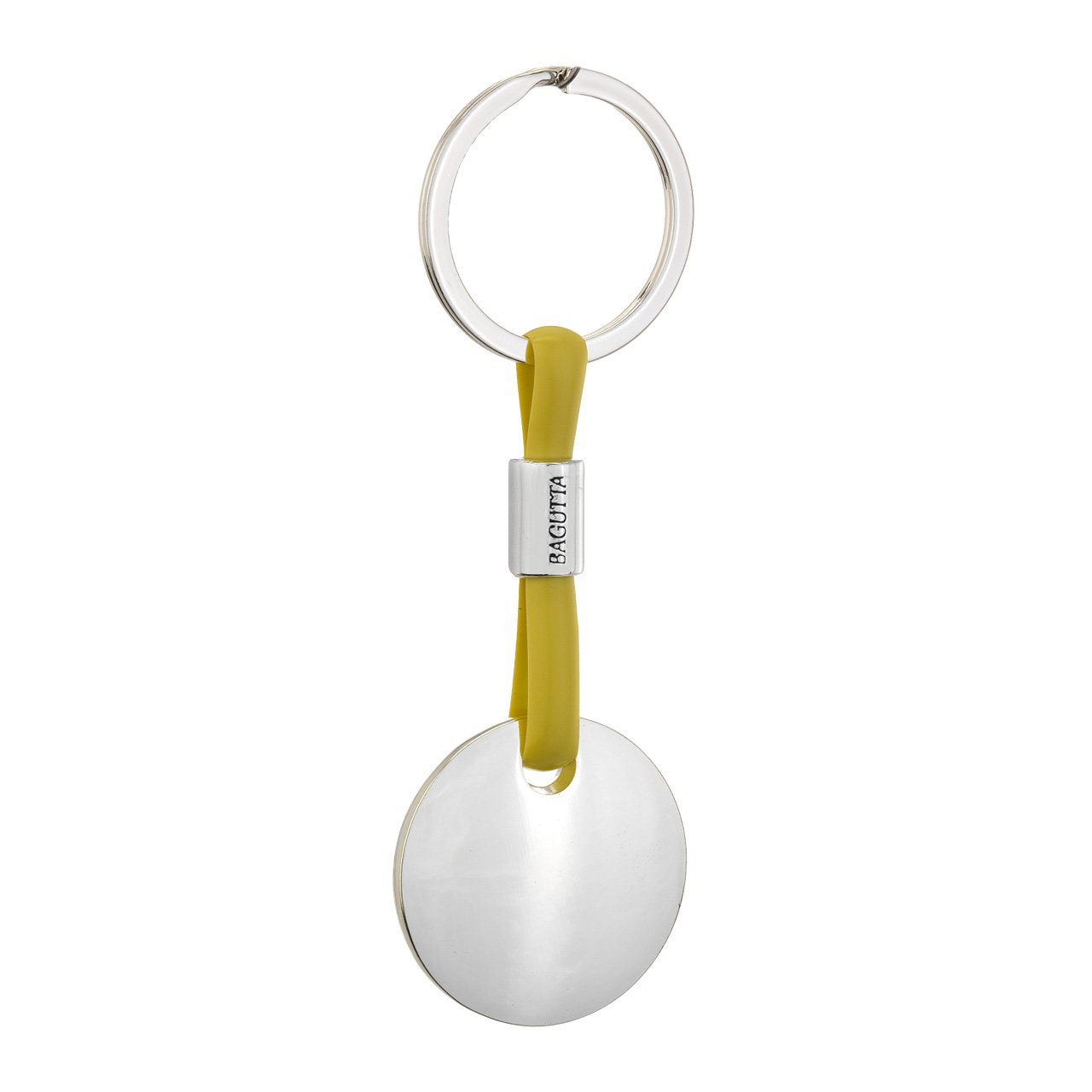 PORTACHIAVI SILVER PLATED CON TARGHETTA TONDA CORDONE IN SILICONE SENAPE