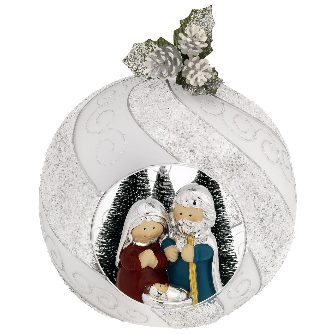 SFERA APERTA ONDE GLITTERATE ARGENTO D. 120 CON ALBERELLI E PRESEPE H. 55