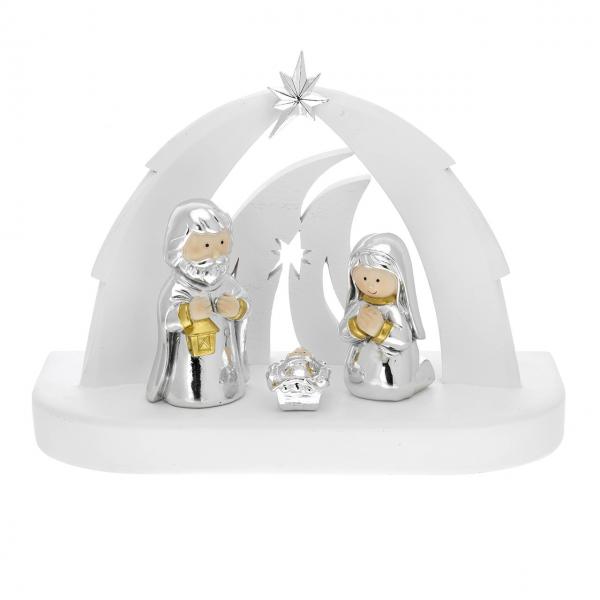 CAPANNA BIANCA CON ARCO STILIZZATO E LED CON PRESEPE 3 PEZZI H. 10 ARGENTATO
