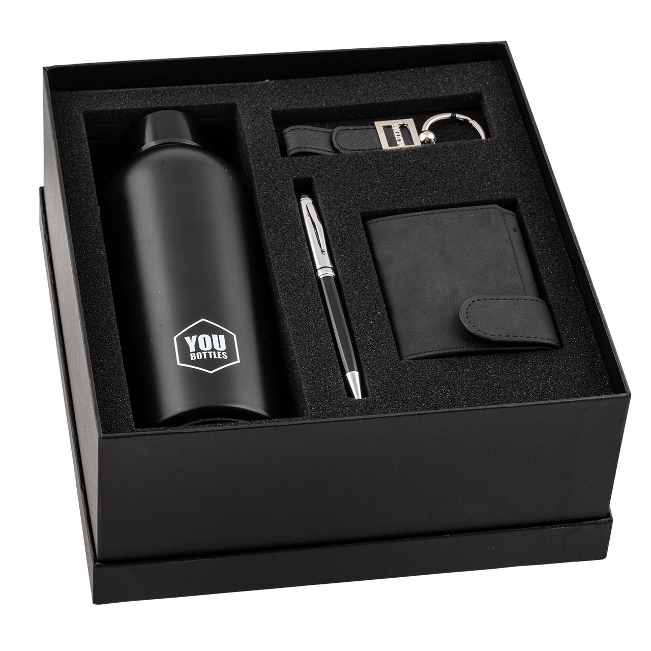 ASTUCCIO NERO CON PORTACHIAVI + PENNA + PORTAFOGLIO + BOTTIGLIA NERA