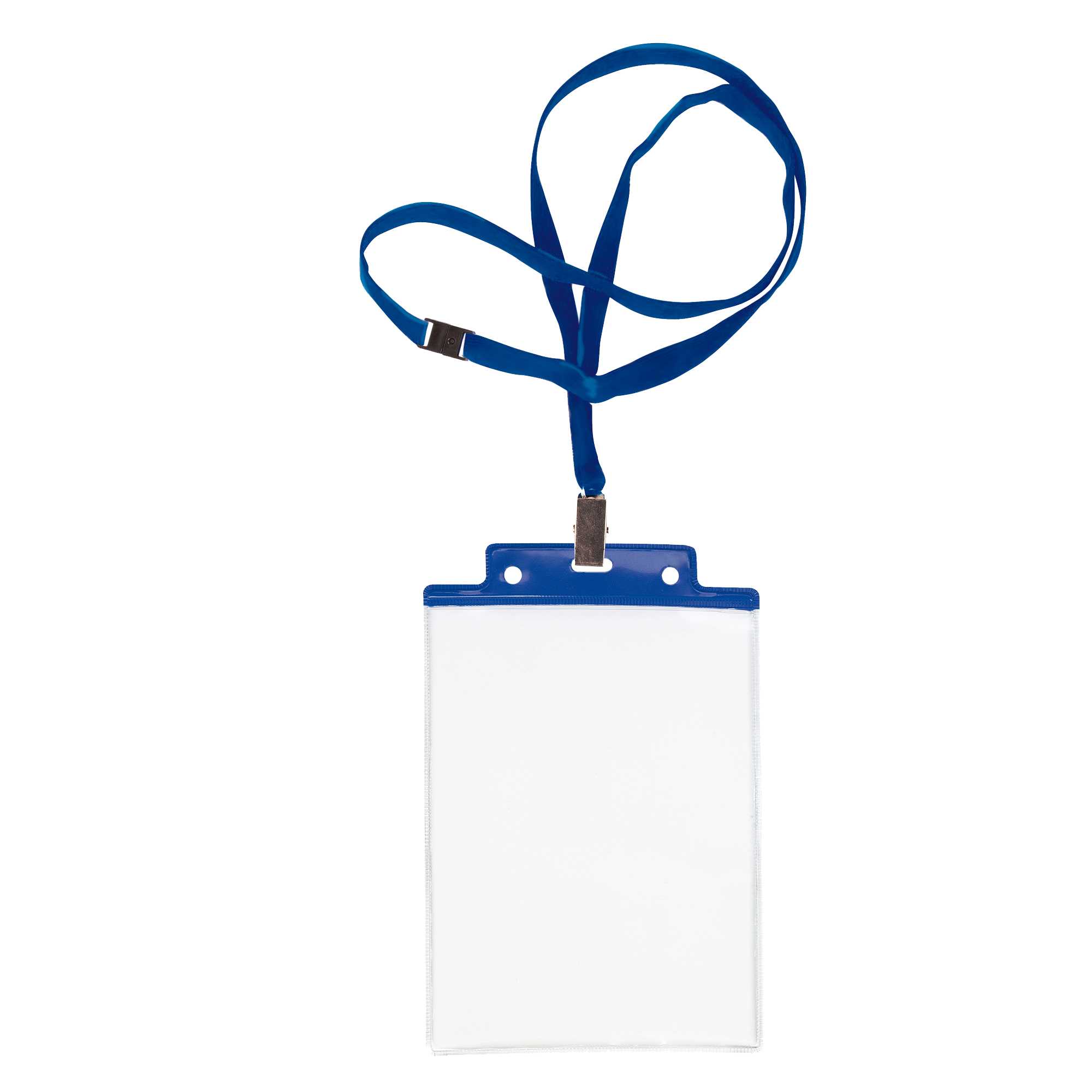 PORTA NOMI IN PVC TRASPARENTE PESANTE CON CORDONCINO BLU CON DETTAGLI BLU. PINZETTA E CHIUSURA ANTISOFFOCAMENTO. FORMATO CONTENUTO 10X15 CM. APERTURA LATO CORTO (ALTO)