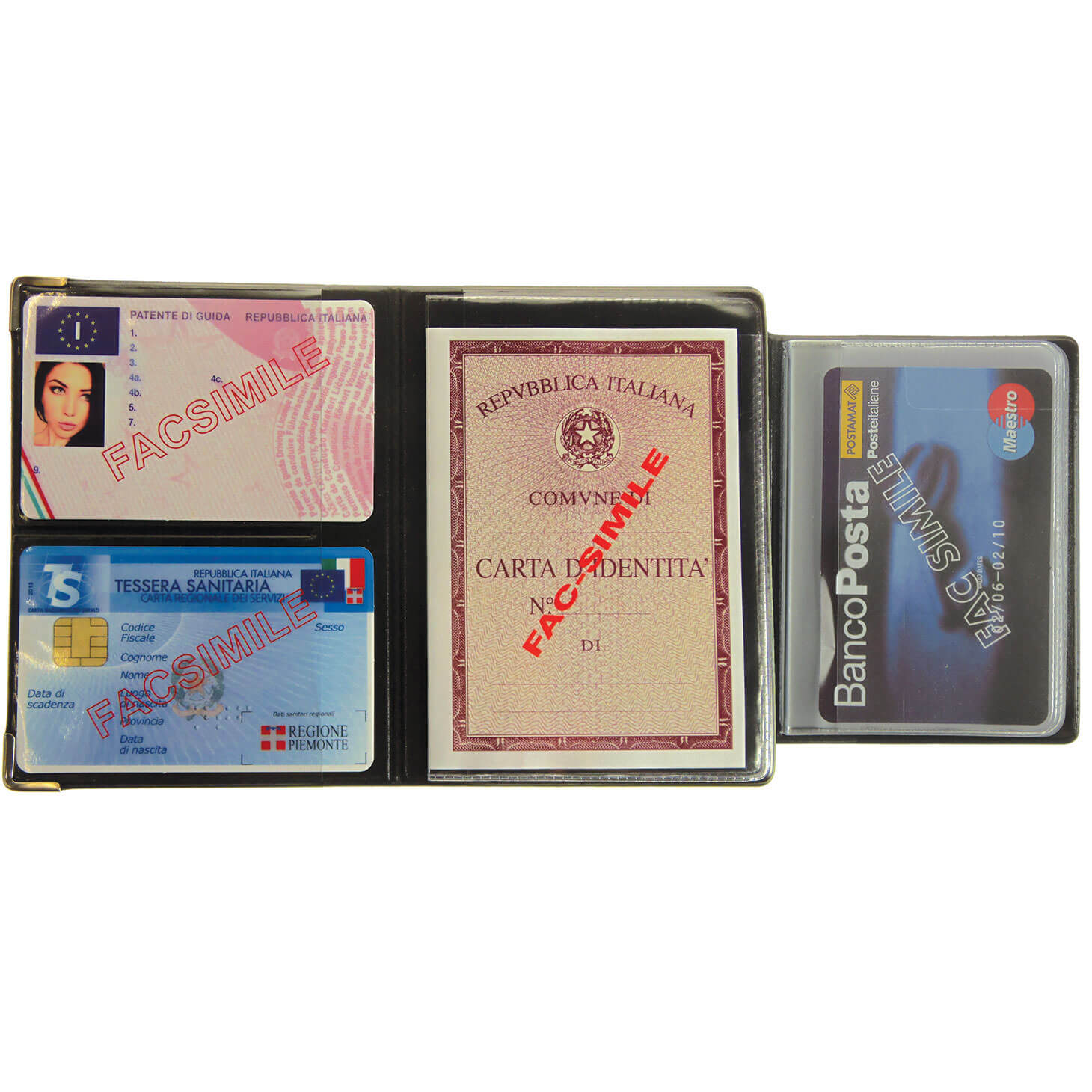 Portadocumenti multiplo. Copertina in pvc espanso sergè e similpelle, spessore 1,2 mm, angoli in metallo con finitura nichel, custodia in pvc cristal con fac simile per carta d’identità, 2 scomparti per patente europea e tessera sanitaria scomparto con inserto a libretto per 5 card in pvc antistatico.