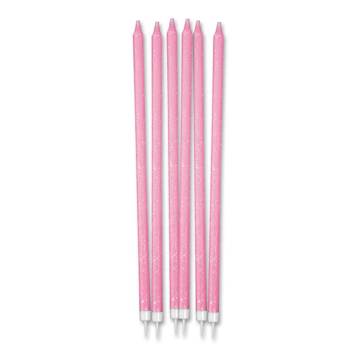 12 Candeline Matite Glitter 15 cm Rosa + Supporto