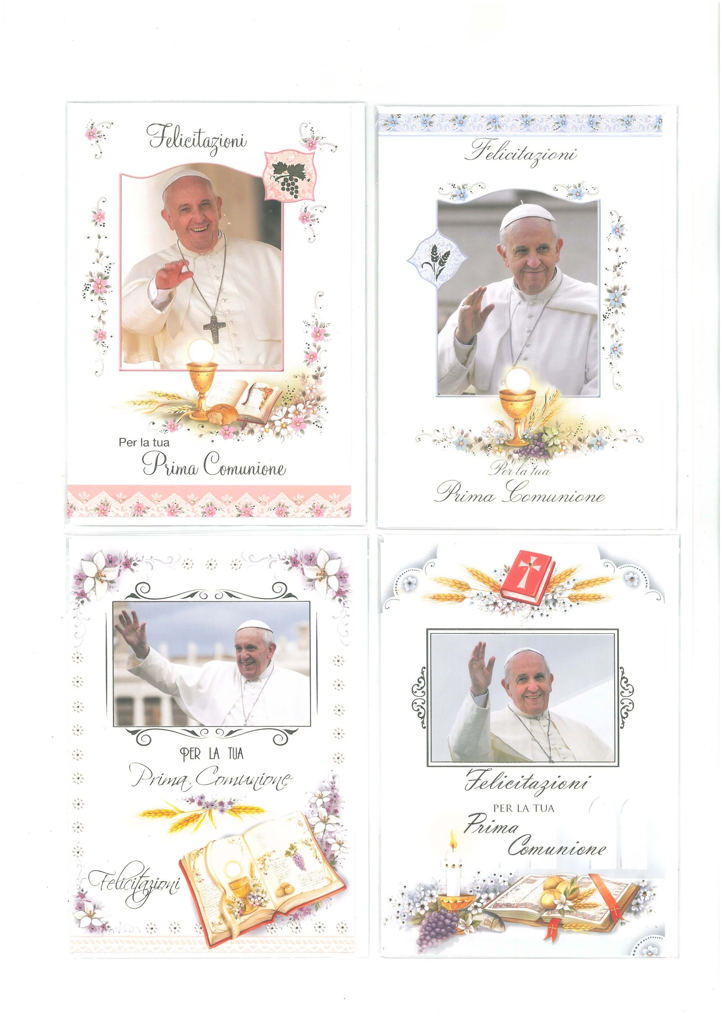 I biglietti Comunione con il Papa sono perfetti per celebrare questo importante sacramento con un tocco di sacralità e affetto. Questi biglietti, decorati con immagini del Papa e simboli religiosi, offrono un modo solenne per inviare auguri e un dono speciale durante la Prima Comunione.• Design Sacro e Significativo: Ogni biglietto è decorato con immagini del Papa, insieme ai simboli della comunione come il calice, l'ostia e il libro delle scritture. I colori tenui e i dettagli dorati aggiungono un tocco di eleganza e sacralità.• Qualità Superiore: Realizzati con carta di alta qualità, questi biglietti sono resistenti e duraturi. La stampa di alta qualità garantisce che i colori rimangano vividi e i dettagli ben definiti.• Confezione da 12 Pezzi: La confezione contiene 12 biglietti, suddivisi in 4 soggetti diversi (3 pezzi per soggetto). Questa varietà consente di scegliere il biglietto più adatto per ogni destinatario, aggiungendo un tocco personale ai tuoi auguri.• Porta Soldi Integrato: Questi biglietti includono una tasca porta soldi, rendendoli ideali per aggiungere un dono monetario al tuo messaggio di auguri.• Senza Testo Interno: Questi biglietti sono senza testo all'interno, permettendoti di personalizzare i tuoi auguri con messaggi personali e unici.• Buste Incluse: Ogni biglietto viene fornito con una busta coordinata, pronta per essere inviata. Le buste abbinate ai biglietti mantengono un aspetto elegante e coerente.I biglietti Comunione con il Papa sono la scelta perfetta per celebrare questo importante sacramento con sacralità e affetto. La loro bellezza e la qualità superiore li rendono ideali per condividere le tue benedizioni e auguri con amici e familiari.