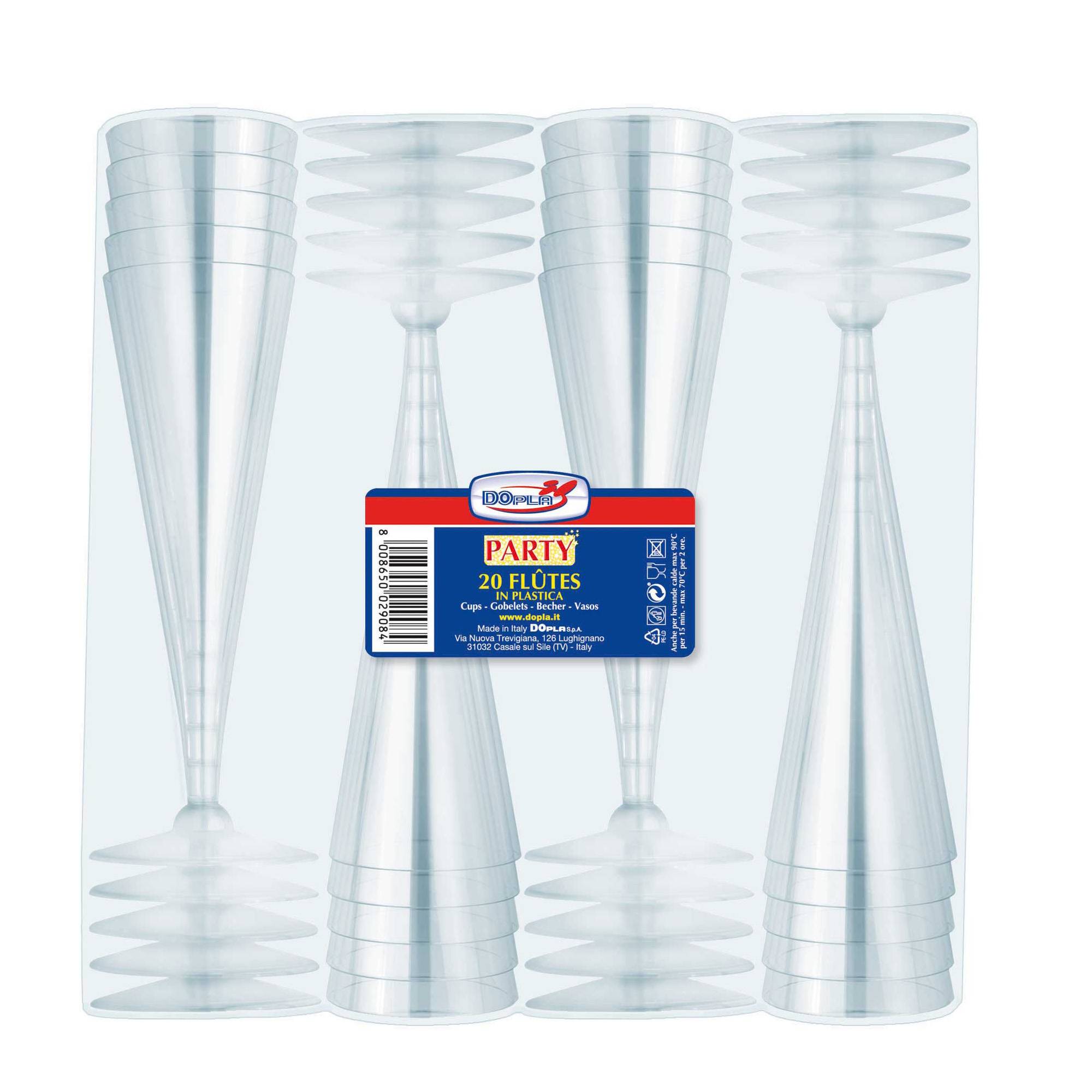 FLUTES IN PLASTICA (POLISTIROLO) TRASPARENTE. RIUTILIZZABILI IN LAVASTOVIGLIE PER 20 LAVAGGI.