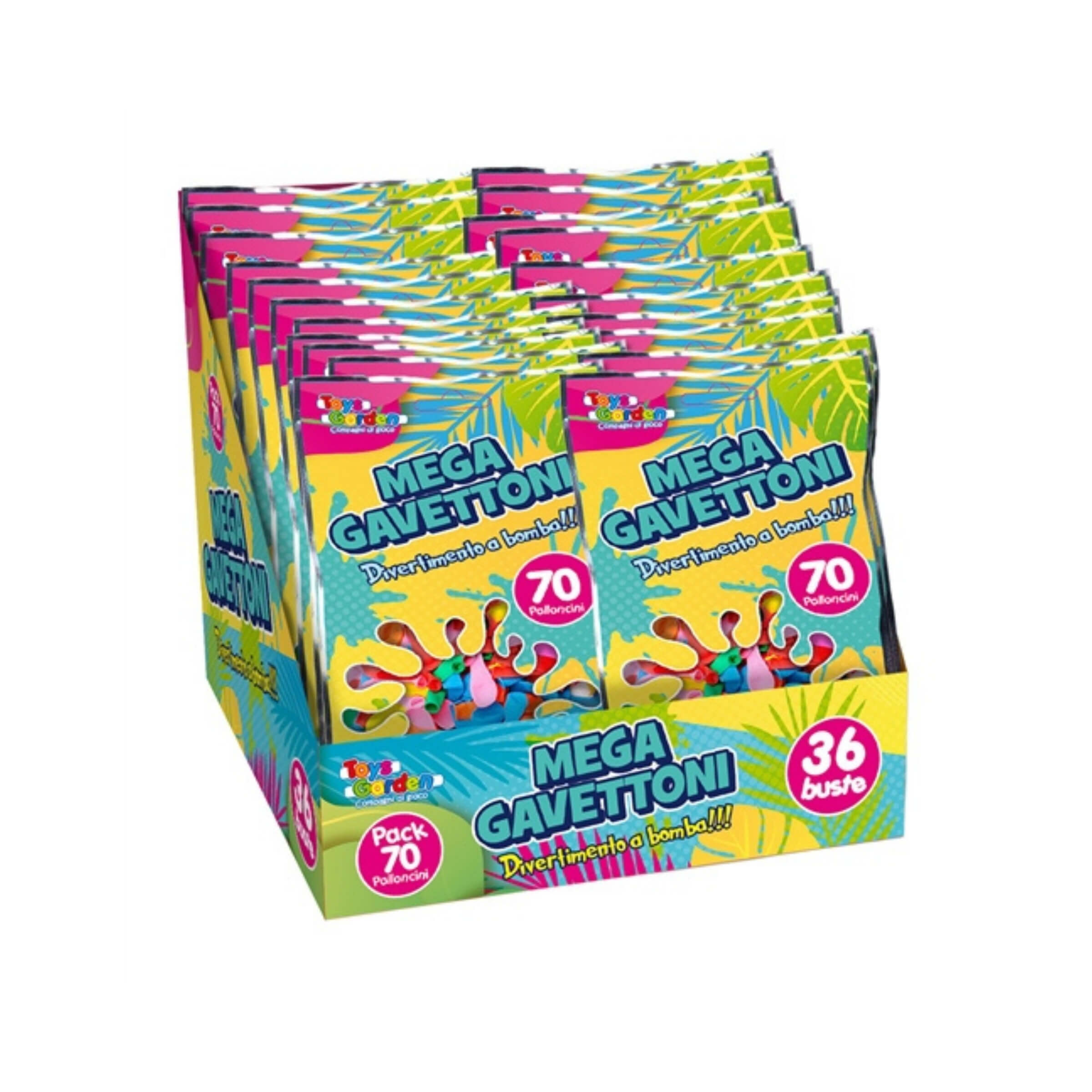 Le giornate calde trovano il loro sfogo perfetto nei giochi d’acqua all’aperto, e i gavettoni rimangono un classico intramontabile per divertirsi tra amici o in famiglia. Questo display da 36 buste Mega Gavettoni è pensato per offrire un'esperienza di gioco semplice, immediata e travolgente. Ogni busta contiene ben 70 palloncini colorati per bombe d'acqua, ideali per creare battaglie acquatiche memorabili durante feste, picnic o pomeriggi estivi in giardino.• 70 palloncini per busta: Ogni confezione include 70 mini palloncini colorati, progettati per il riempimento con acqua e pronti all’uso in pochi secondi.• Adattatore incluso: All’interno di ogni busta è presente un pratico adattatore da rubinetto che consente di riempire facilmente i palloncini senza bisogno di accessori aggiuntivi.• Annodaballo semplificato: La confezione include anche uno strumento per facilitare la chiusura dei palloncini, rendendo il gioco adatto anche ai più piccoli.• Colori assortiti: I palloncini sono disponibili in una vivace gamma di colori misti, perfetti per creare un effetto visivo coinvolgente durante il gioco.• Espositore da 36 buste: Il prodotto è confezionato in un pratico display da banco con 36 buste singole, ideale per punti vendita, eventi estivi o feste con molti partecipanti.Con il set Mega Gavettoni ogni momento diventa un’occasione per rinfrescarsi e ridere insieme, grazie a un’attività semplice e sempre amata. L’estate si accende di colore, movimento e leggerezza con un gioco che stimola socialità, riflessi e spensieratezza.
