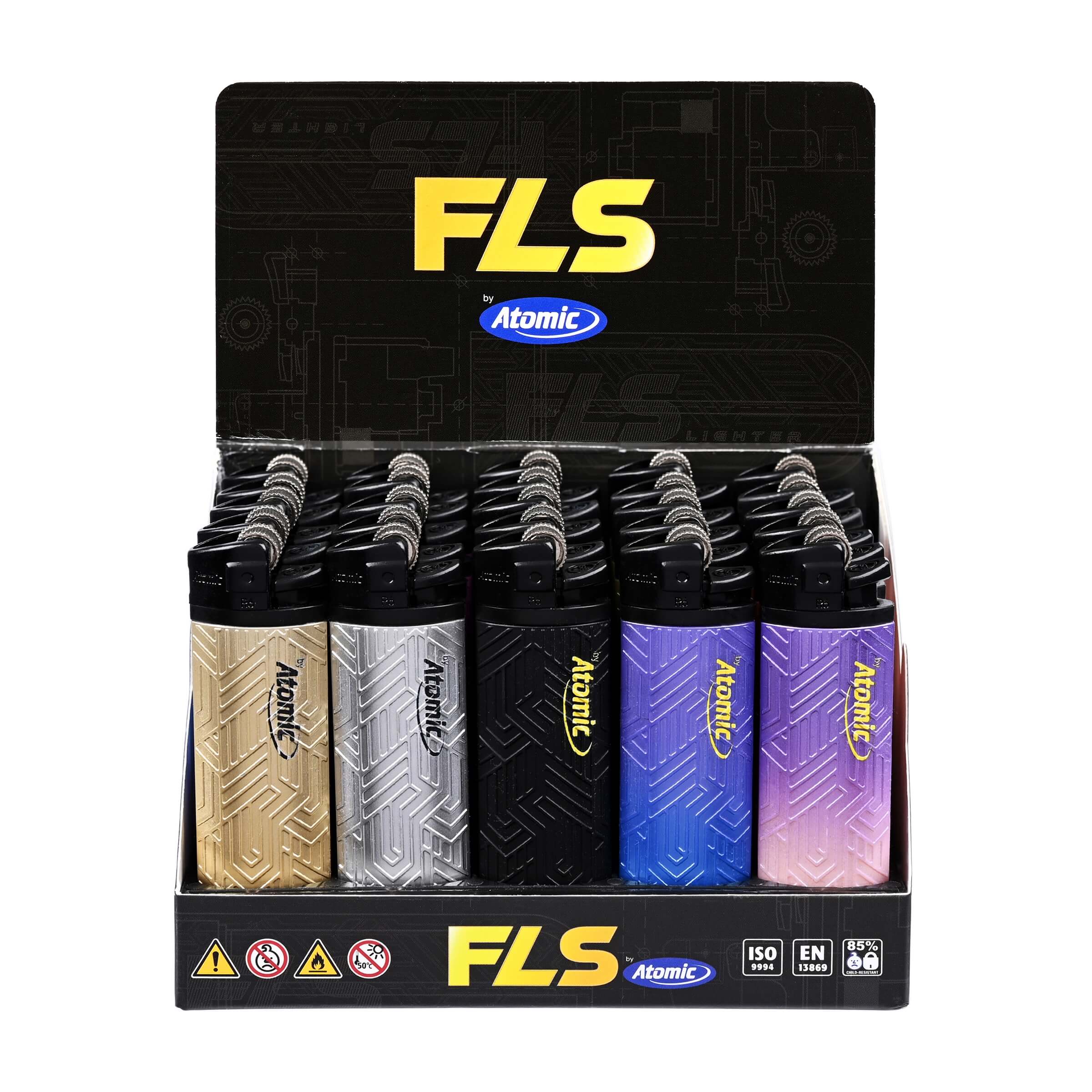 • Espositore da 25 pezzi: Il prodotto viene fornito in un display da banco composto da 25 accendini assortiti, perfetto per la vendita al dettaglio, con layout ordinato e packaging firmato Atomic FLS.
