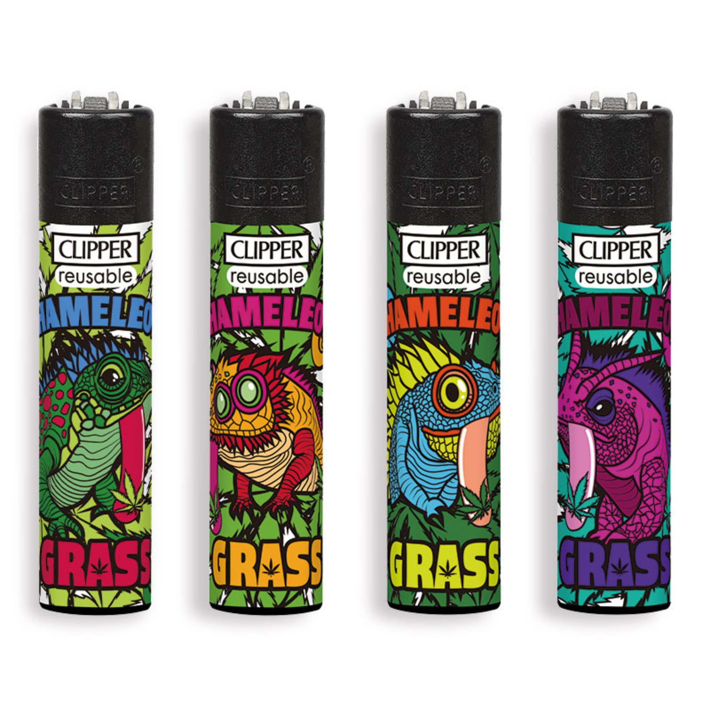 Un’estetica psichedelica, surreale e intensamente visiva dà vita alla collezione Clipper Large Chameleon Grass, una linea che si ispira ai mondi fantastici delle creature mimetiche e all’iconografia delle culture alternative. Ogni accendino presenta l'immagine di un camaleonte dai colori accesi e saturi, immerso in pattern vegetali che richiamano forme erbacee, foglie stilizzate e ambienti immaginari. L'effetto cromatico è sorprendente: sfondi fluo, occhi ipnotici, contrasti intensi. L’intero design comunica una visione onirica e anticonvenzionale, perfetta per chi ama uno stile forte e senza compromessi. Le grafiche sono realizzate tramite stampa diretta ad alta definizione, per assicurare nitidezza e resistenza anche con un uso quotidiano.