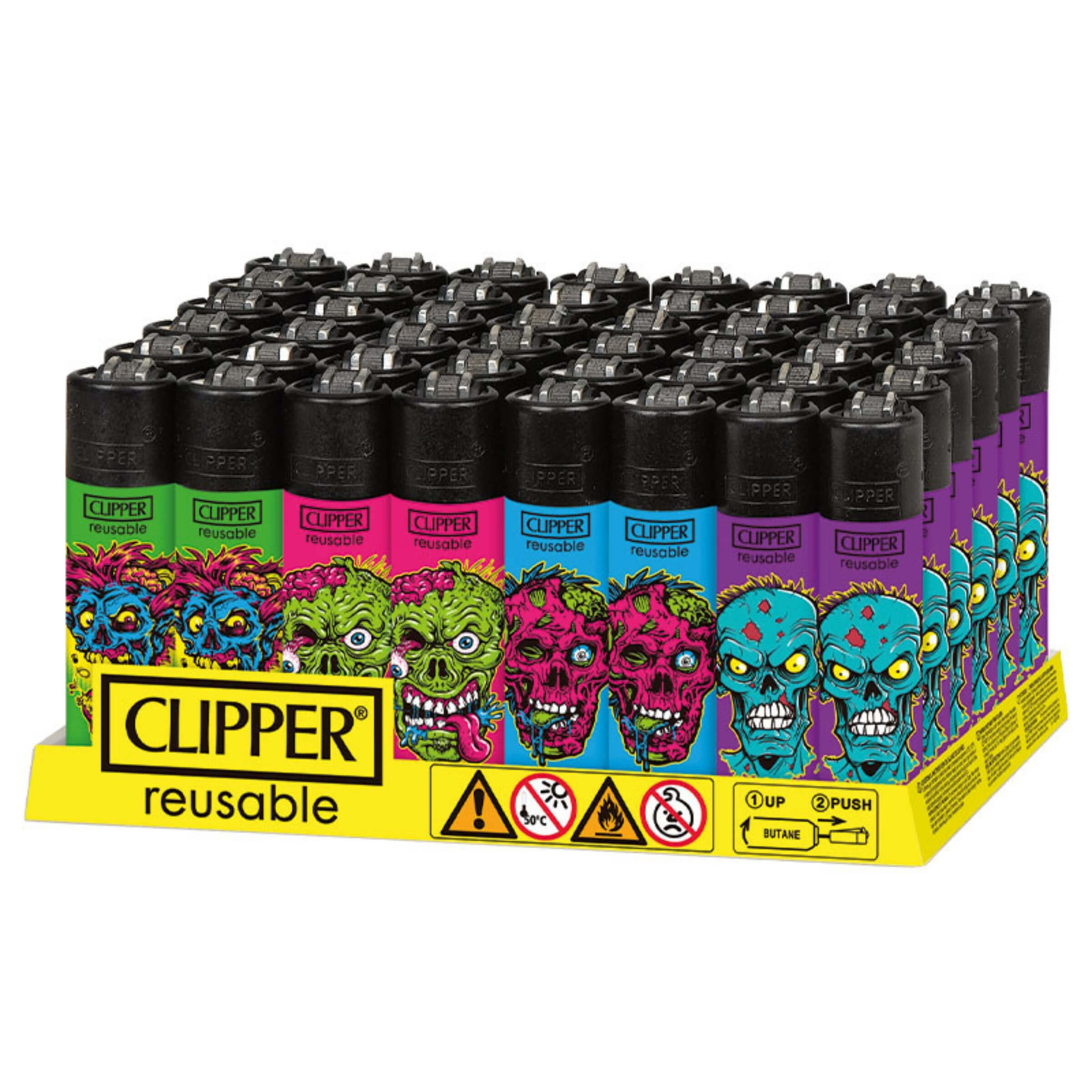 Un’esplosione di colore, irriverenza e stile underground prende forma nella collezione Clipper Cool Brains, una linea di accendini in formato Large che trasforma il mondo degli zombie in un’espressione grafica provocatoria e ironica. Ogni accendino raffigura un teschio o una creatura grottesca in stile cartoon horror, ma con colori fluo, linee dinamiche e una composizione visiva che richiama la street art e il mondo della grafica underground. Il tono visivo è forte, diretto e volutamente eccessivo, pensato per chi ama collezionare oggetti fuori dagli schemi o semplicemente desidera uno stile inconfondibile anche negli oggetti quotidiani. Le grafiche, applicate tramite stampa diretta ad alta definizione, sono vivide e resistenti all’usura.