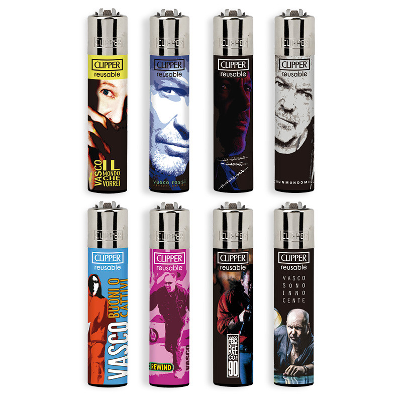 Pietrina - fiamma. Finitura: stampa diretta.Espositore girevole in plastica precaricato da 192 accendini large grafica.Vasco Rossi, noto anche semplicemente come Vasco o con l'appellativo BlascoAutodefinitosi "provocautore" è considerato uno dei maggiori esponenti della musica rock italiana ed ora è presente con la sua figura sugli accendini Clipper