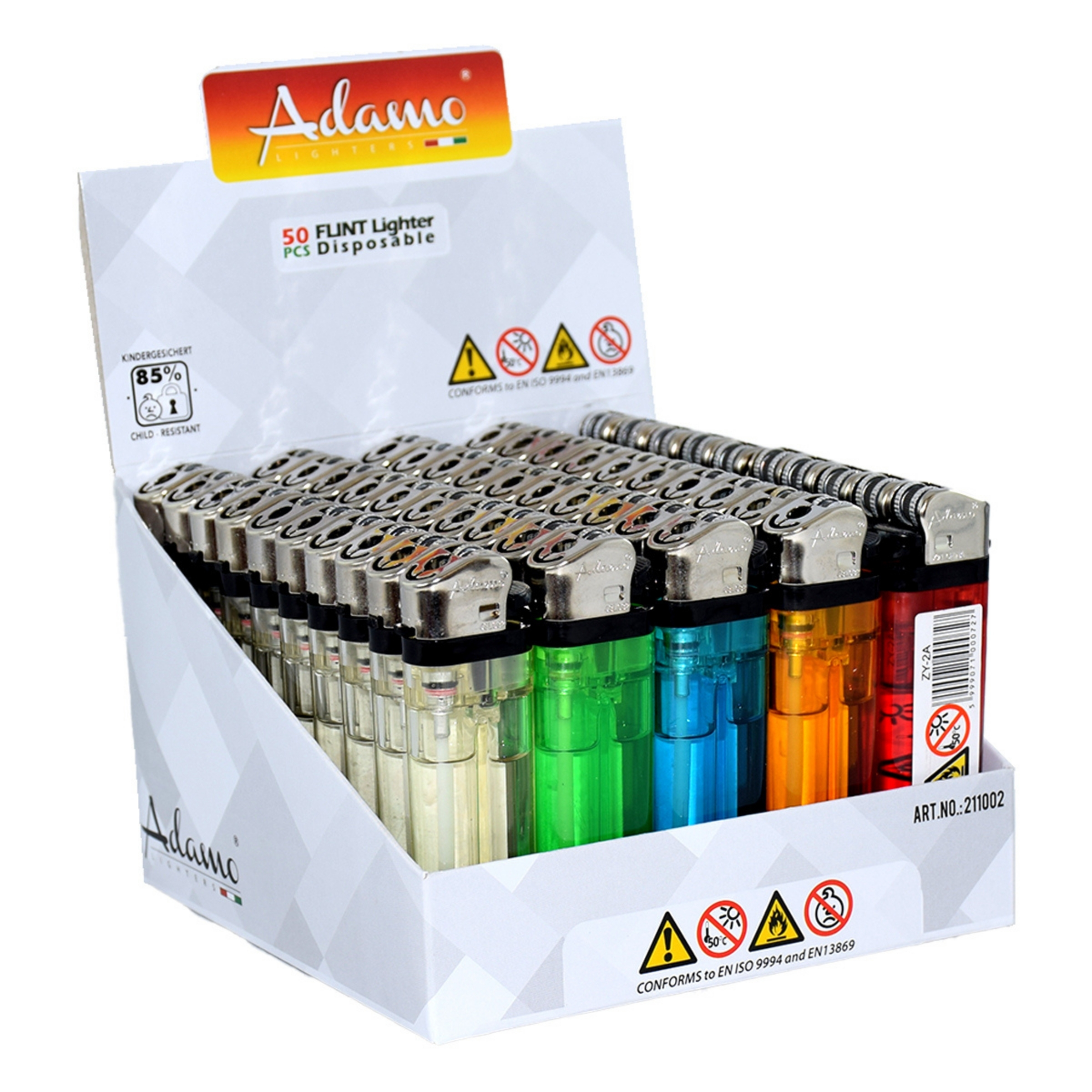 Gli accendini a pietrina Adamo Classic sono affidabili, pratici e perfetti per l'uso quotidiano. Con il loro design semplice e funzionale, garantiscono accensioni rapide e sicure. Questi accendini sono ideali per qualsiasi occasione e rappresentano un'opzione versatile per chi cerca qualità e durata.• Accensione a Pietrina: Sistema tradizionale a pietrina per un'accensione semplice e immediata.• Design Trasparente: Corpo trasparente per controllare facilmente il livello di gas residuo.• Vari Colori: Disponibili in una varietà di colori vivaci, come rosso, blu, arancione, verde e trasparente.• Confezione da 50 Pezzi: Perfetti per bar, tabaccherie, negozi e per l'uso quotidiano.• Affidabilità e Durata: Gli accendini Adamo Classic sono progettati per offrire lunga durata e prestazioni costanti.Questi accendini sono un accessorio indispensabile, pratici e resistenti, perfetti per chi cerca una soluzione semplice e funzionale.